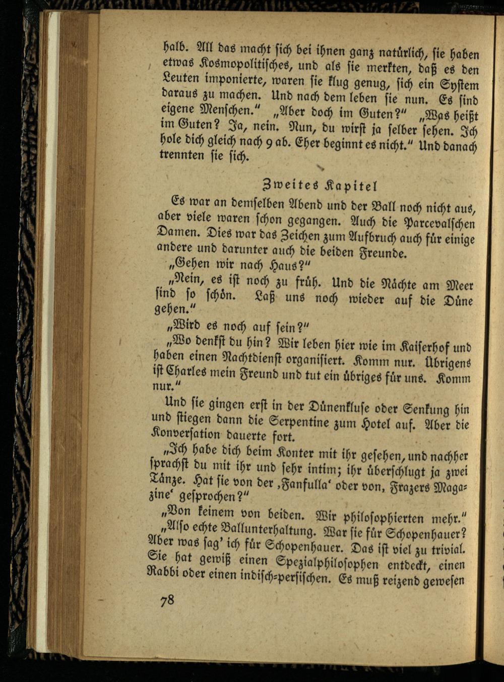 „Also echte Ballunterhaltung. War sie für Schopenhauer? Aber was sag' ich für Schopenhauer. Das ist viel zu trivial. Sie hat gewiß einen Spczialphilosophen entdeckt, einen Rabbi oder einen indisch-persischen. Es muß reizend gewesen