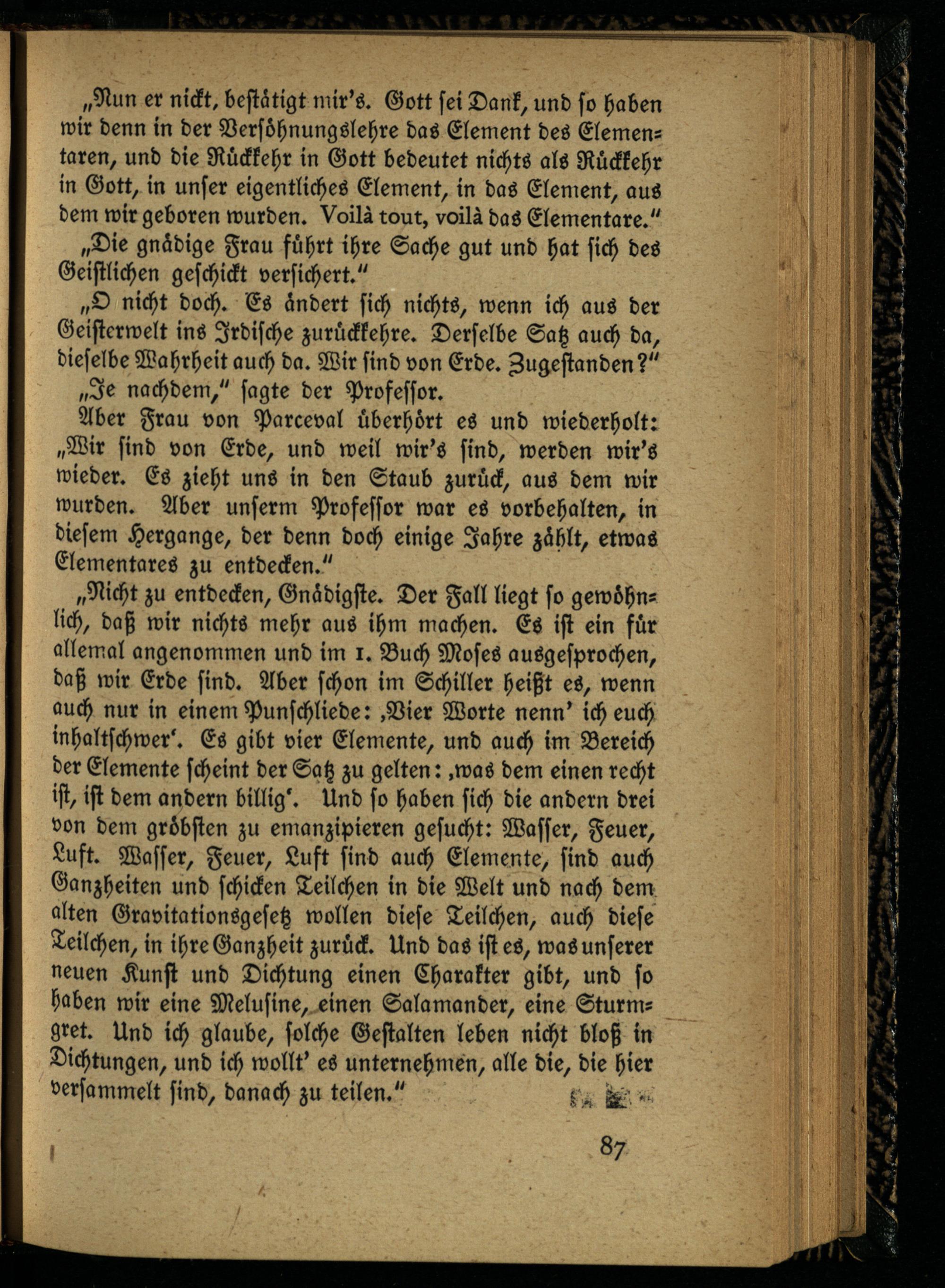 „Nicht zu entdecken, Gnädigste. Der Fall liegt so gewöhnlich, daß wir nichts mehr aus ihm machen. Es ist ein für allemal angenommen und im i. Buch Moses ausgesprochen, daß wir Erde sind. Aber schon im Schiller heißt es, wenn auch nur in einem Punschliede: .Vier Worte nenn' ich euch inhaltschwer'. Es gibt vier Elemente, und auch im Bereich der Elemente scheint der Satz zu gelten: .was dem einen recht ist, ist dem andern billig'. Und so haben sich die andern drei von dem gröbsten zu emanzipieren gesucht: Wasser, Feuer, Luft. Wasser, Feuer, Luft sind auch Elemente, sind auch Ganzheiten und schicken Teilchen in die Welt und nach dem alten Gravitationsgesetz wollen diese Teilchen, auch diese Teilchen, in ihre Ganzheit zurück. Und das ist es, was unserer neuen Kunst und Dichtung einen Charakter gibt, und so haben wir eine Melusine, einen Salamander, eine Sturm- gret. Und ich glaube, solche Gestalten leben nicht bloß in Dichtungen, und ich wollt' es unternehmen, alle die, die hier versammelt sind, danach zu teilen."