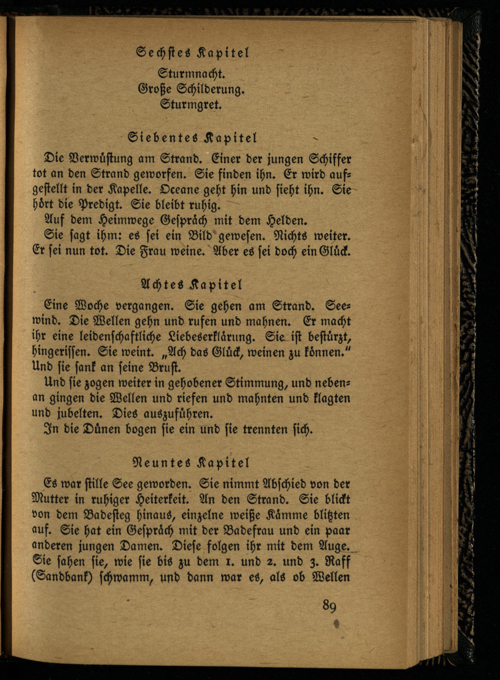 Es war stille See geworden. Sie nimmt Abschied von der Mutter in ruhiger Heiterkeit. An den Strand. Sie blickt von dem Badesteg hinaus, einzelne weiße Kämme blitzten auf. Sie hat ein Gespräch mit der Badefrau und ein paar anderen jungen Damen. Diese folgen ihr mit dem Auge. Sie sahen sie, wie sie bis zu dem r. und r. und z. Raff (Sandbank) schwamm, und dann war es, als ob Wellen