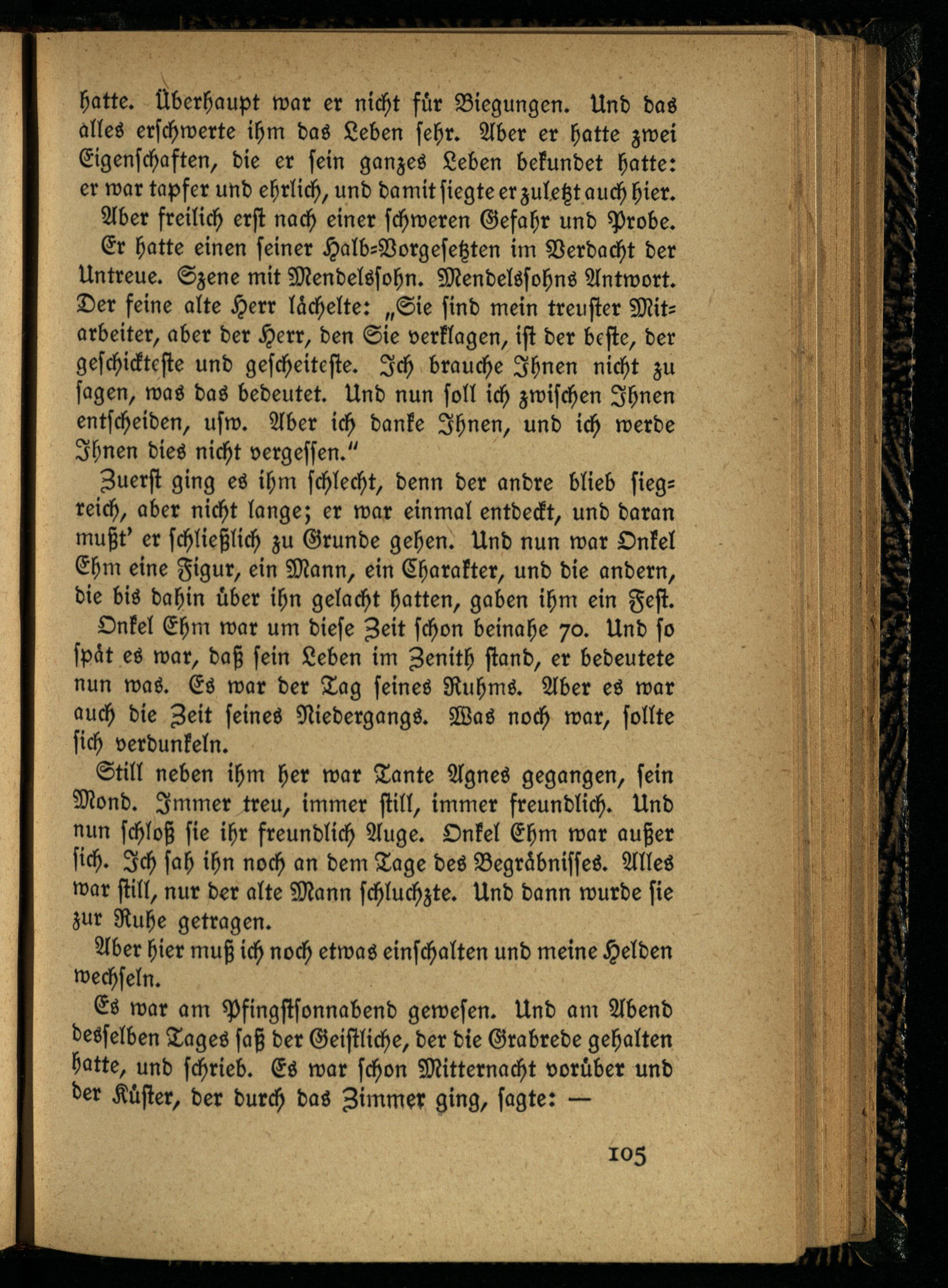 Still neben ihm her war Tante Agnes gegangen, sein Mond. Immer treu, immer still, immer freundlich. Und nun schloß sie ihr freundlich Auge. Onkel Ehm war außer sich- Ich sah ihn noch an dem Tage des Begräbnisses. Alles war still, nur der alte Mann schluchzte. Und dann wurde sie zur Ruhe getragen.