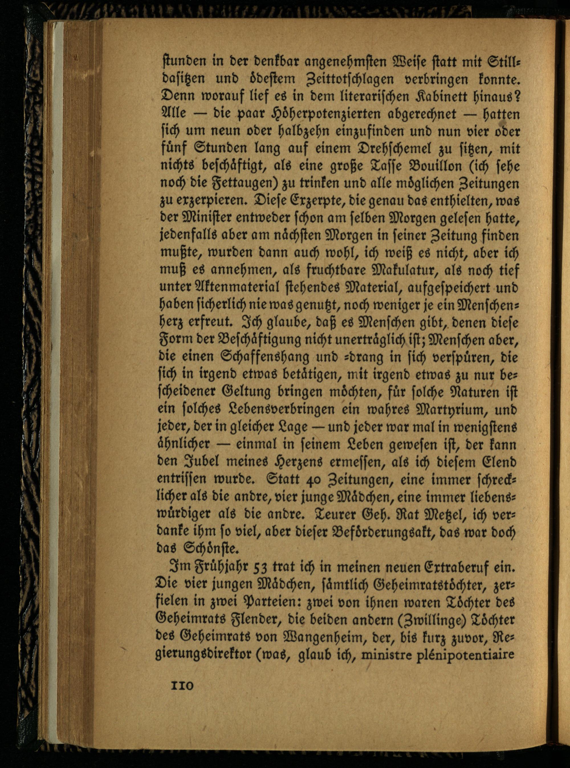 Im Frühjahr 53 trat ich in meinen neuen Extraberuf ein. Die vier jungen Mädchen, sämtlich Geheimratstöchter, zerfielen in zwei Parteien: zwei von ihnen waren Töchter des Geheimrats Flender, die beiden andern (Zwillinge) Töchter des Geheimrats von Wangenheim, der, bis kurz zuvor, Regierungsdirektor (was, glaub ich, minisrie xläniporenrisire