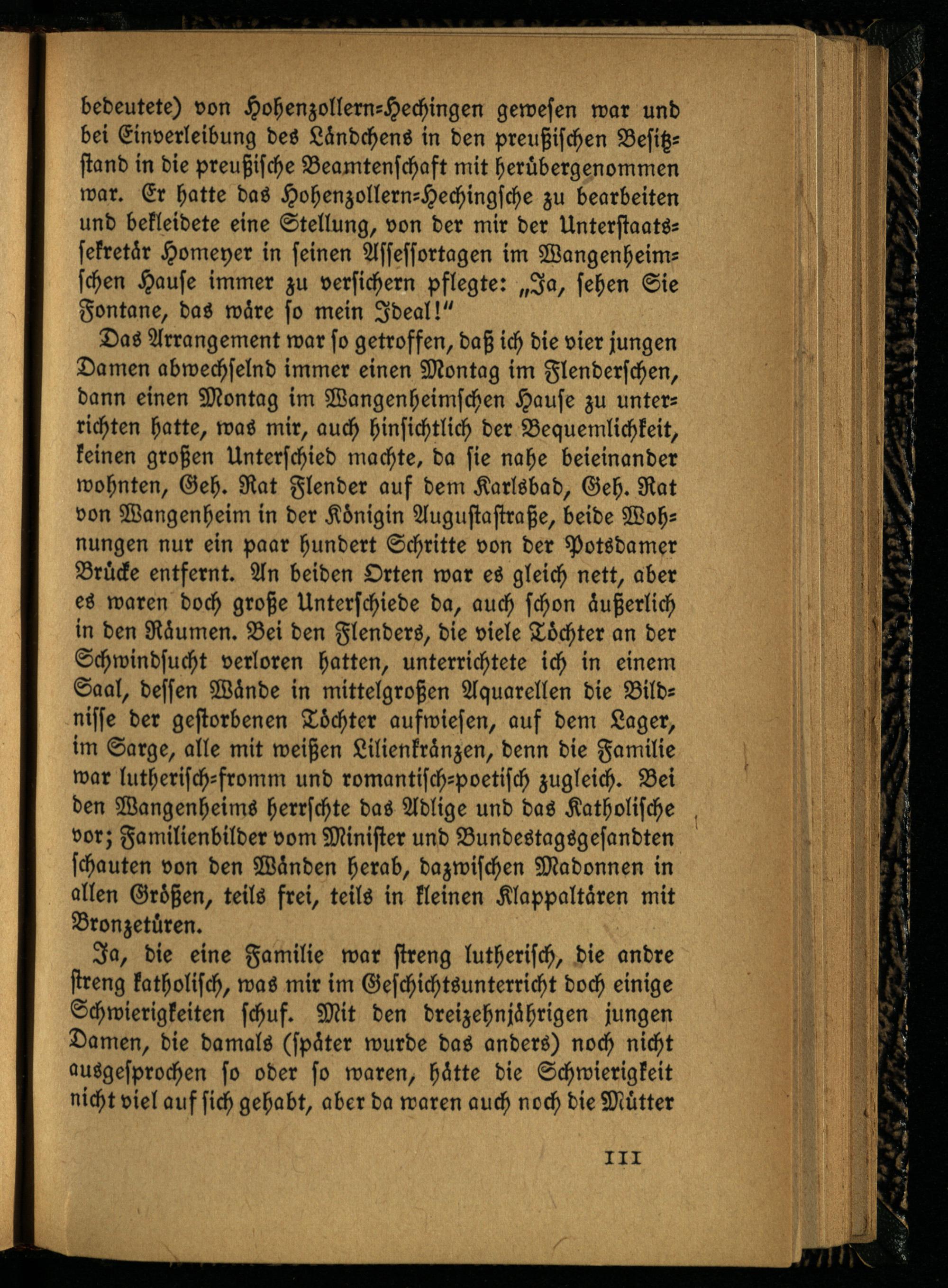 Das Arrangement war so getroffen, daß ich die vier jungen Damen abwechselnd immer einen Montag im Flenderschen, dann einen Montag im Wangenheimschen Hause zu unterrichten hatte, was mir, auch hinsichtlich der Bequemlichkeit, keinen großen Unterschied machte, da sie nahe beieinander wohnten, Geh. Rat Flender auf dem Karlsbad, Geh. Rat von Wangenheim in der Königin Augustastraße, beide Wohnungen nur ein paar hundert Schritte von der Potsdamer Brücke entfernt. An beiden Orten war es gleich nett, aber es waren doch große Unterschiede da, auch schon äußerlich in den Räumen. Bei den FlenderS, die viele Töchter an der Schwindsucht verloren hatten, unterrichtete ich in einem Saal, dessen Wände in mittelgroßen Aquarellen die Bildnisse der gestorbenen Töchter aufwiesen, auf dem Lager, im Sarge, alle mit weißen Lilienkränzen, denn die Familie war lutherisch-fromm und romantisch-poetisch zugleich. Bei den Wangenheims herrschte das Adlige und das Katholische vor; Familienbilder vom Minister und Bundestagsgesandten schauten von den Wänden herab, dazwischen Madonnen in allen Größen, teils frei, teils in kleinen Klappaltären mit Bronzetüren.