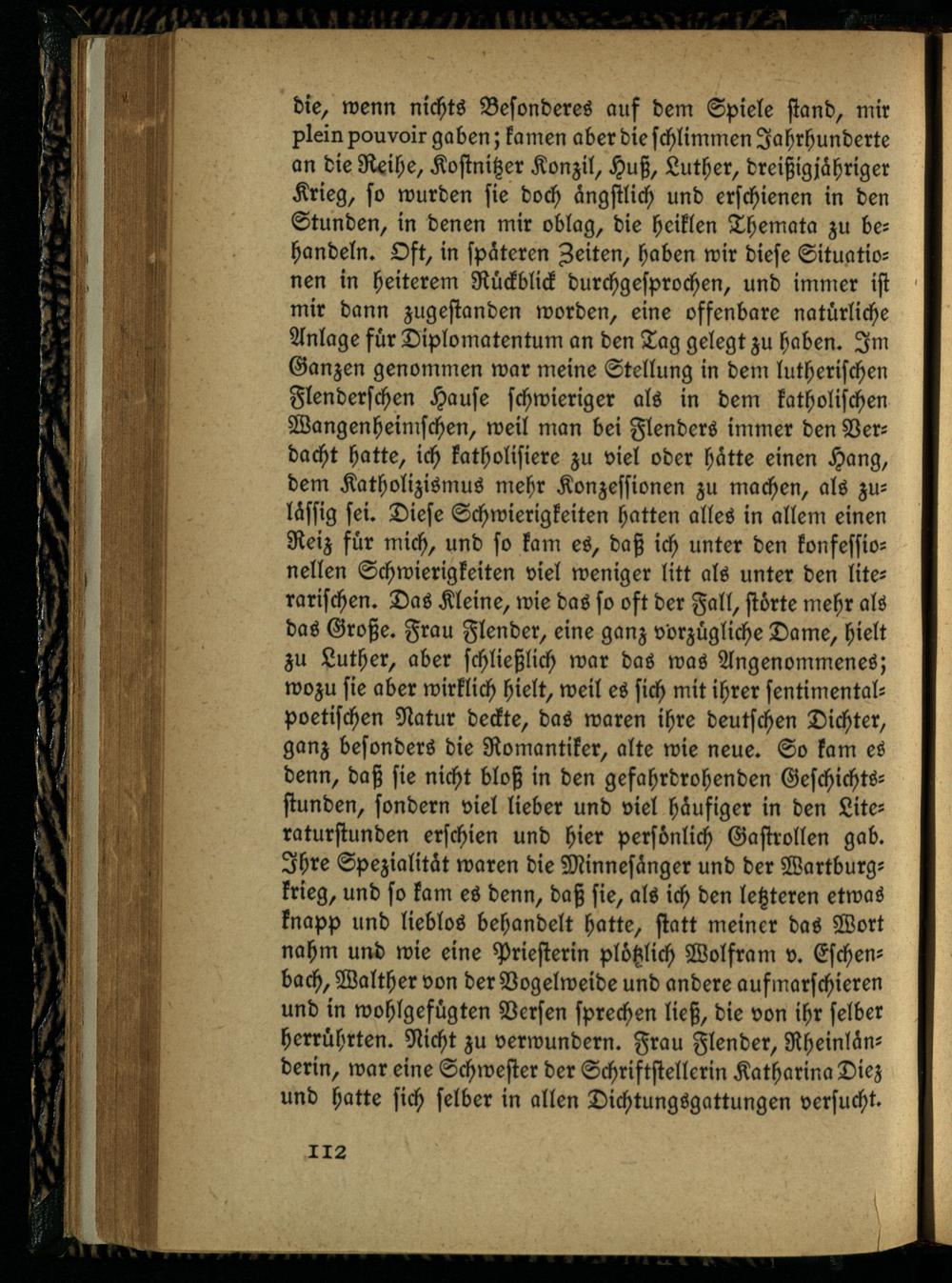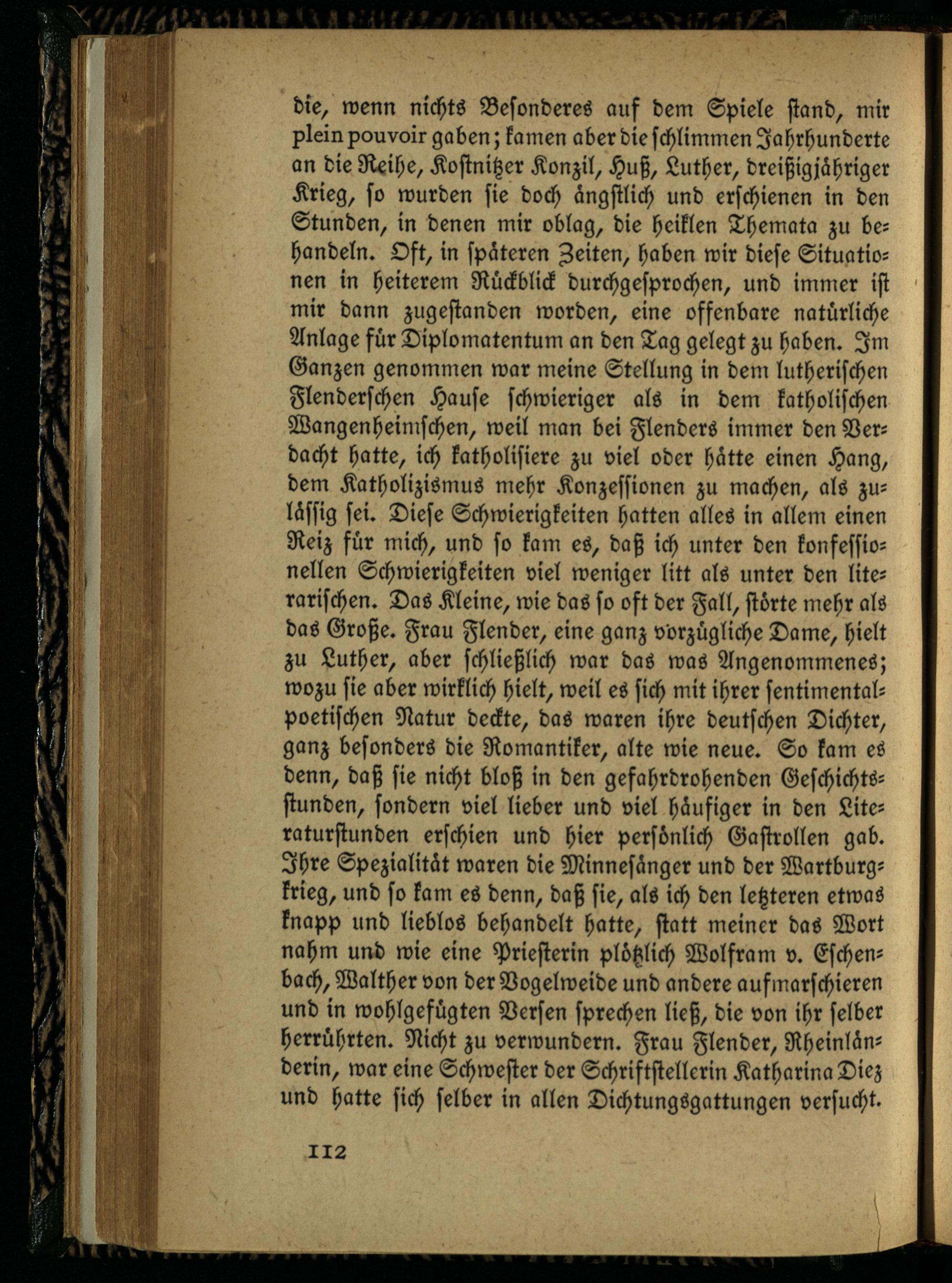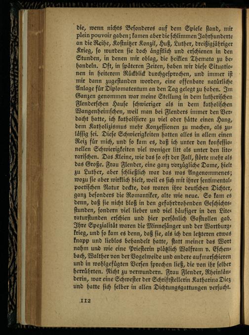 die, wenn nichts Besonderes auf dem Spiele stand, mir plein xouvoir gaben; kamen aber die schlimmen Jahrhunderte an die Reihe, Kostnitzer Konzil, Huß, Luther, dreißigjähriger Krieg, so wurden sie doch ängstlich und erschienen in den Stunden, in denen mir oblag, die heiklen Themata zu behandeln. Oft, in späteren Zeiten, haben wir diese Situationen in heiterem Rückblick durchgesprochen, und immer ist mir dann zugestanden worden, eine offenbare natürliche Anlage für Diplomatentum an den Tag gelegt zu haben. Im Ganzen genommen war meine Stellung in dem lutherischen Flenderschen Hause schwieriger als in dem katholischen Wangenheimschen, weil man bei Flenders immer den Verdacht hatte, ich katholisiere zu viel oder hätte einen Hang, dem Katholizismus mehr Konzessionen zu machen, als zulässig sei. Diese Schwierigkeiten hatten alles in allem einen Reiz für mich, und so kam es, daß ich unter den konfessionellen Schwierigkeiten viel weniger litt als unter den literarischen. Das Kleine, wie das so oft der Fall, störte mehr als das Große. Frau Flender, eine ganz vorzügliche Dame, hielt zu Luther, aber schließlich war das was Angenommenes; wozu sie aber wirklich hielt, weil es sich mit ihrer sentimentalpoetischen Natur deckte, das waren ihre deutschen Dichter, ganz besonders die Romantiker, alte wie neue. So kam es denn, daß sie nicht bloß in den gefahrdrohenden Geschichtsstunden, sondern viel lieber und viel häufiger in den Literaturstunden erschien und hier persönlich Gastrollen gab. Ihre Spezialität waren die Minnesänger und der Wartburgkrieg, und so kam es denn, daß sie, als ich den letzteren etwas knapp und lieblos behandelt hatte, statt meiner das Wort nahm und wie eine Priesterin plötzlich Wolfram v. Eschenbach, Walther von der Vogelweide und andere aufmarschieren und in wohlgefügten Versen sprechen ließ, die von ihr selber herrührten. Nicht zu verwundern. Frau Flender, Rheinländerin, war eine Schwester der Schriftstellerin Katharina Diez und hatte sich selber in allen Dichtungsgattungen versucht.
