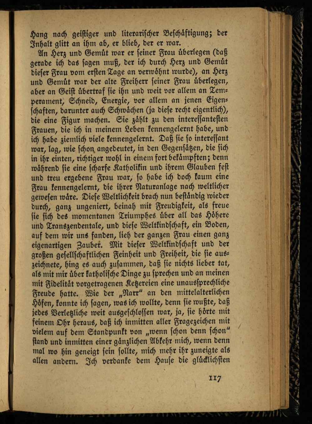 An Herz und Gemüt war er seiner Frau überlegen (daß gerade ich das sagen muß, der ich durch Herz und Gemüt dieser Frau vom ersten Tage an verwöhnt wurde), an Herz und Gemüt war der alte Freiherr seiner Frau überlegen, aber an Geist übertraf sie ihn und weit vor allem an Temperament, Schneid, Energie, vor allem an jenen Eigenschaften, darunter auch Schwächen (ja diese recht eigentlich), die eine Figur machen. Sie zählt zu den interessantesten Frauen, die ich in meinem Leben kennengelernt habe, und ich habe ziemlich viele kennengelernt. Daß sie so interessant war, lag, wie schon, angedeutet, in den Gegensätzen, die sich in ihr einten, richtiger wohl in einem fort bekämpften; denn während sie eine scharfe Katholikin und ihrem Glauben fest und treu ergebene Frau war, so habe ich doch kaum eine Frau kennengelernt, die ihrer Naturanlage nach weltlicher gewesen wäre. Diese Weltlichkeit brach nun beständig wieder durch, ganz ungeniert, beinah mit Freudigkeit, als freue sie sich des momentanen Triumphes über all das Höhere und Transzendentale, und diese Weltkindschaft, ein Boden, auf dem wir uns fanden, lieh der ganzen Frau einen ganz eigenartigen Zauber. Mit dieser Weltkindschaft und der großen gesellschaftlichen Feinheit und Freiheit, die sie auszeichnete, hing es auch zusammen, daß sie nichts lieber tat, als mit mir über katholische Dinge zu sprechen und an meinen mit Fidelität vorgetragenen Ketzereien eine unaussprechliche Freude hatte. Wie der „Narr" an den mittelalterlichen Höfen, konnte ich sagen, was ich wollte, denn sie wußte, daß jedes Verletzliche weit ausgeschlossen war, ja, sie hörte mit feinem Ohr heraus, daß ich inmitten aller Fragezeichen mit vielem auf dem Standpunkt von „wenn schon denn schon" stand und inmitten einer gänzlichen Abkehr mich, wenn denn mal wo hin geneigt sein sollte, mich mehr ihr zuneigte als allen andern. Ich verdanke dem Hause die glücklichsten