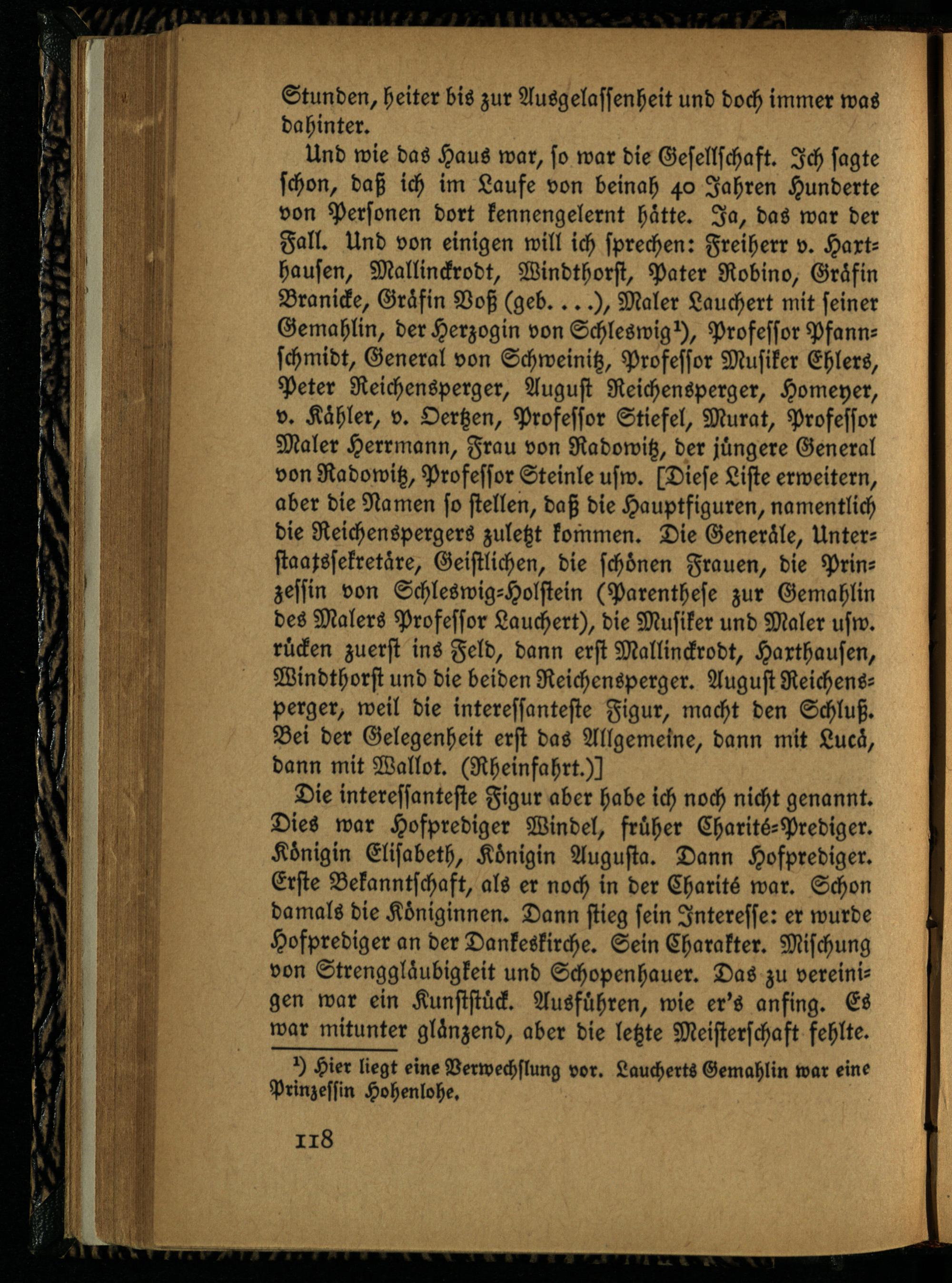 Die interessanteste Figur aber habe ich noch nicht genannt. Dies war Hofprediger Windel, früher Charits-Prediger. Königin Elisabeth, Königin Augusta. Dann Hofprediger. Erste Bekanntschaft, als er noch in der Charits war. Schon damals die Königinnen. Dann stieg sein Interesse: er wurde Hofprediger an der Dankeskirche. Sein Charakter. Mischung von Strenggläubigkeit und Schopenhauer. Das zu vereinigen war ein Kunststück. Ausführen, wie er's anfing. Es war mitunter glänzend, aber die letzte Meisterschaft fehlte.