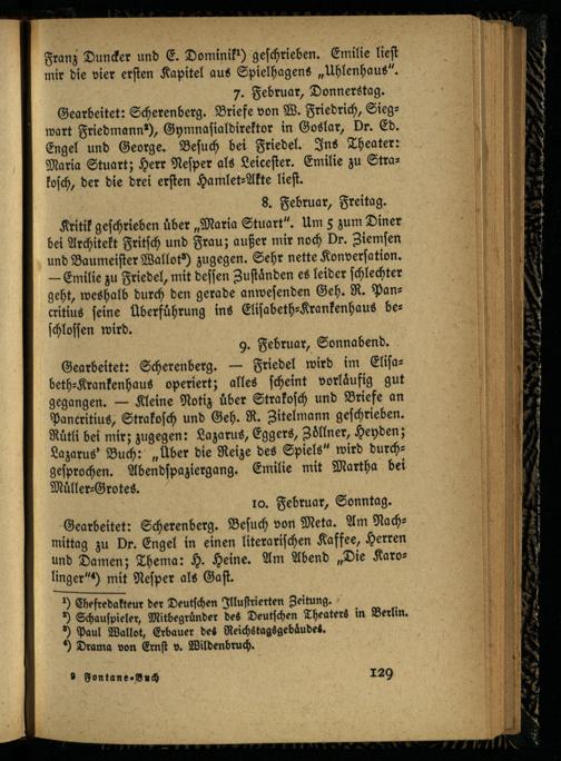 Gearbeitet: Scherenberg. Briefe von W. Friedrich, Siegwart Friedmann *), Gymnasialdirektor in Goslar, Dr. Ed. Engel und George. Besuch bei Friedel. Ins Theater: Maria Stuart; Herr Nesper als Leicester. Emilie zu Stra- kosch, der die drei ersten Hamlet-Akte liest.