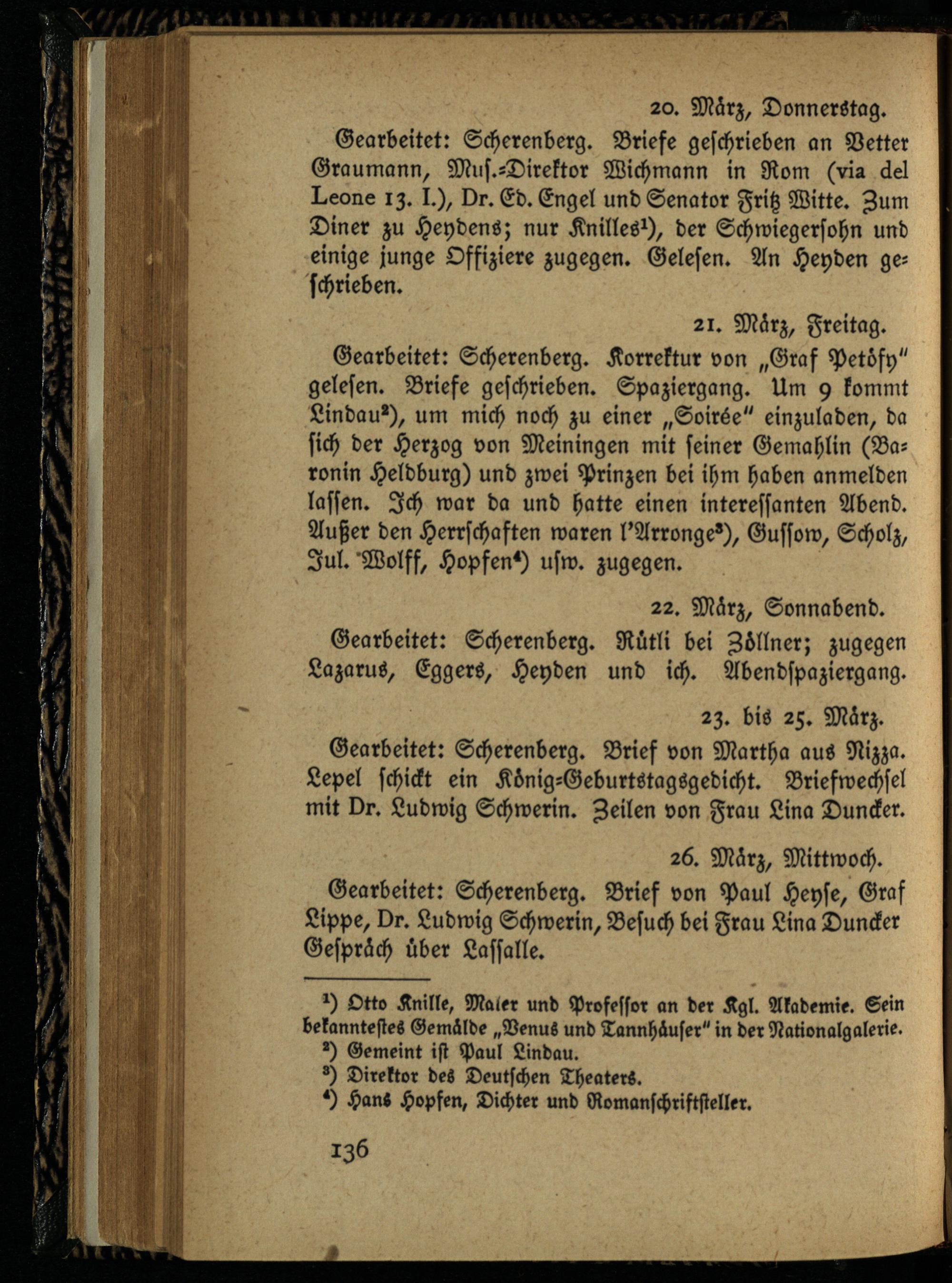 Gearbeitet: Scherenberg. Korrektur von „Graf Petöfy" gelesen. Briefe geschrieben. Spaziergang. Um 9 kommt Lindau *), um mich noch zu einer „Soirée" einzuladen, da sich der Herzog von Meiningen mit seiner Gemahlin (Baronin Heldburg) und zwei Prinzen bei ihm haben anmelden lassen. Ich war da und hatte einen interessanten Abend. Außer den Herrschaften waren l'Arronge *), Gussow, Scholz, Jul. Wolff, Hopfen *) usw. zugegen.
