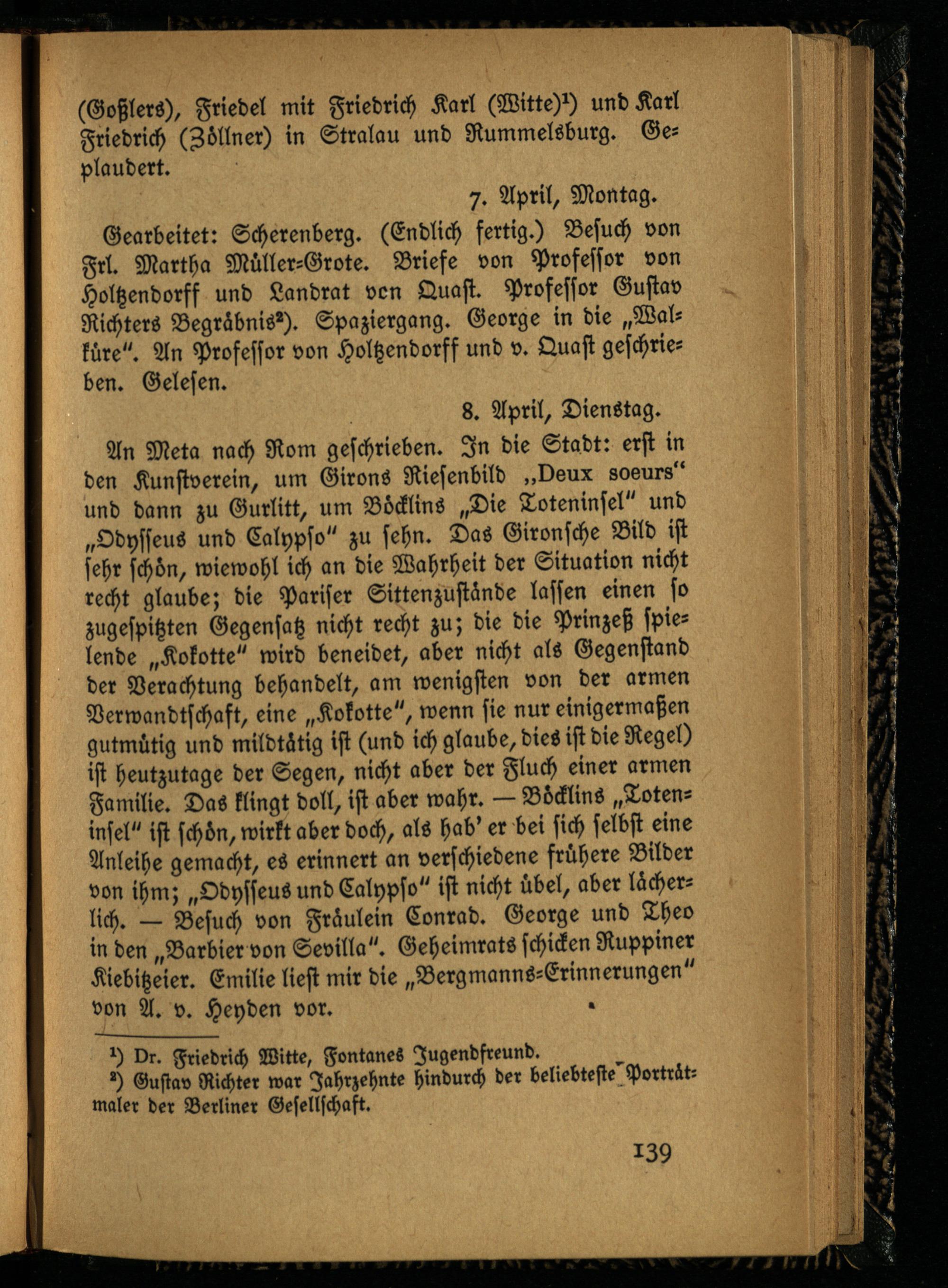 Gearbeitet: Scherenberg. (Endlich fertig.) Besuch von Frl. Martha Müller-Grote. Briefe von Professor von Holtzendorff und Landrat von Quast. Professor Gustav Richters Begräbnis *). Spaziergang. George in die „Walküre". An Professor von Holtzendorff und v. Quast geschrieben. Gelesen.