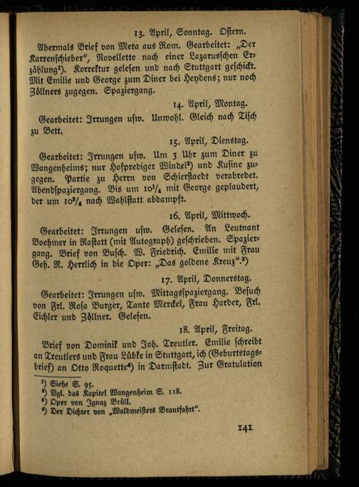 Abermals Brief von Meta aus Rom. Gearbeitet: „Der Karrenschieber", Novellette nach einer Lazarusschen Er- zählung 1). Korrektur gelesen und nach Stuttgart geschickt. Mit Emilie und George zum Diner bei Heydens; nur noch Zöllners zugegen. Spaziergang.