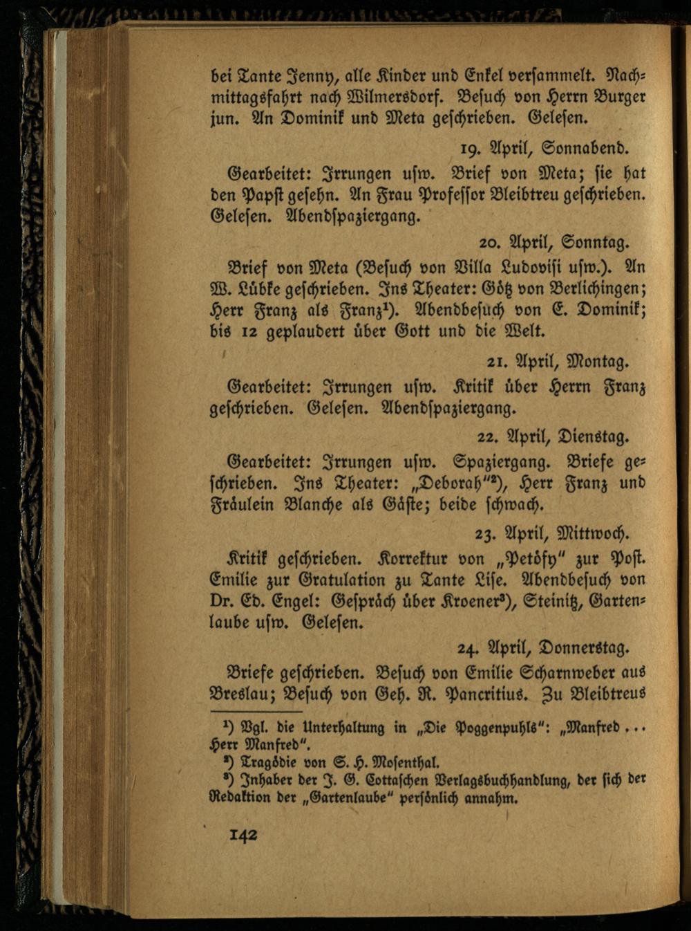 Kritik geschrieben. Korrektur von „Petöfy" zur Post. Emilie zur Gratulation zu Tante Life. Abendbesuch von Dr. Ed. Engel: Gespräch über Kroener *), Steinitz, Gartenlaube usw. Gelesen.