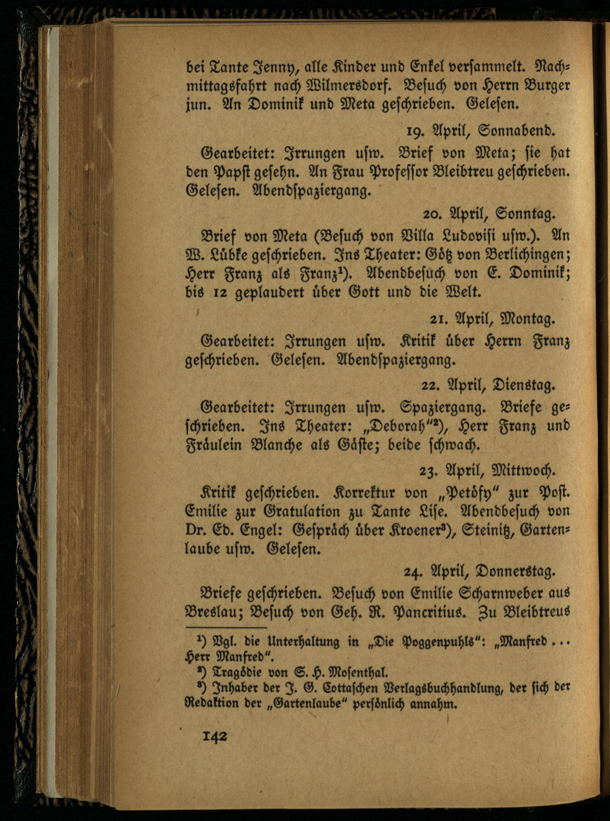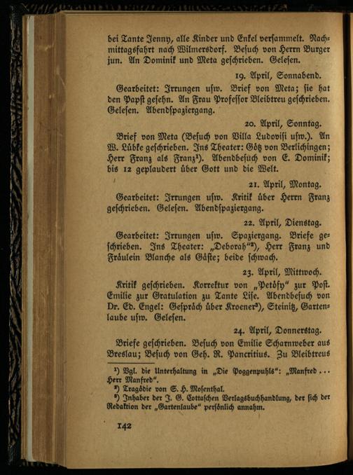 Brief von Meta (Besuch von Villa Ludovisi usw.). An W. Lübke geschrieben. Ins Theater: Götz von Berlichingen; Herr Franz als Franz *). Abendbesuch von E. Dominik; bis 12 geplaudert über Gott und die Welt.