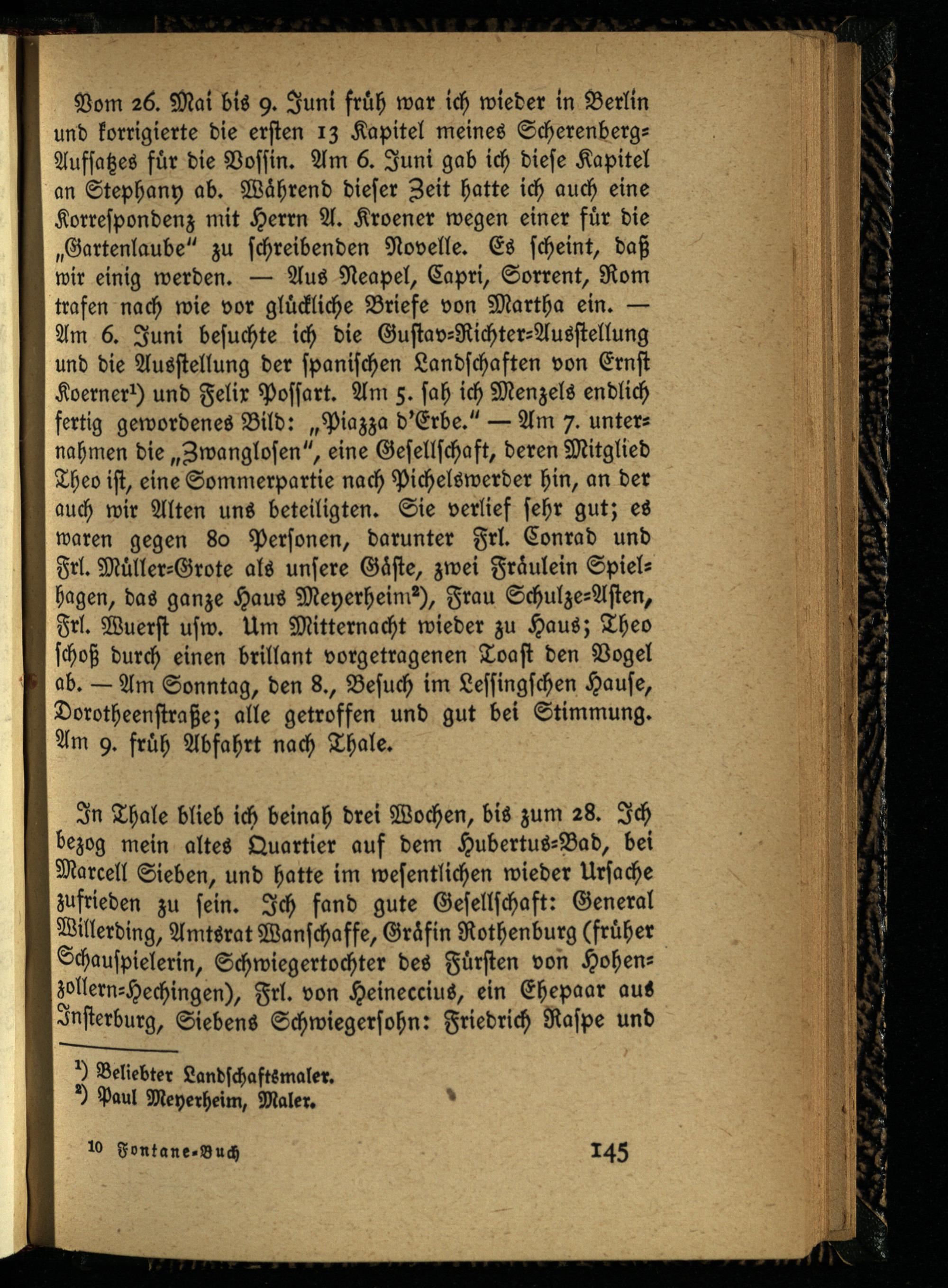 Am 6. Juni besuchte ich die Gustav-Richter-Ausstellung und die Ausstellung der spanischen Landschaften von Ernst Koerner und Felix Possart. Am 5. sah ich Menzels endlich fertig gewordenes Bild: „Piazza d'Erbe." — Am 7. unternahmen die „Zwanglosen", eine Gesellschaft, deren Mitglied Theo ist, eine Sommerpartie nach Pichelswerder hin, an der auch wir Alten uns beteiligten. Sie verlief sehr gut; es waren gegen 80 Personen, darunter Frl. Conrad und Frl. Müller-Grote als unsere Gäste, zwei Fräulein Spielhagen, das ganze Haus Meyerheim ?), Frau Schulze-Asten, Frl. Wuerst usw. Um Mitternacht wieder zu Haus; Theo schoß durch einen brillant vorgetragenen Toast den Vogel ab. — Am Sonntag, den 8., Besuch im Lessingschen Hause, Dorotheenstraße; alle getroffen und gut bei Stimmung. Am 9. früh Abfahrt nach Thals.