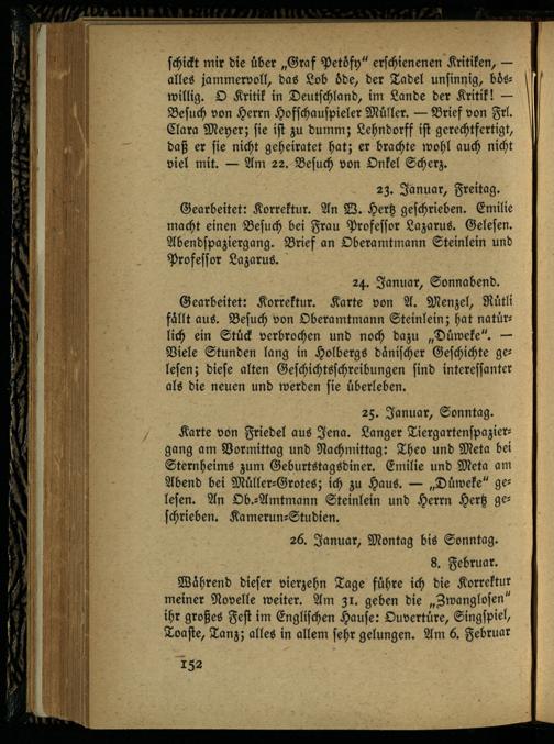 Während dieser vierzehn Tage führe ich die Korrektur meiner Novelle weiter. Am 31. geben die „Zwanglosen" ihr großes Fest im Englischen Hause: Ouvertüre, Singspiel, Toaste, Tanz; alles in allem sehr gelungen. Am 6. Februar
