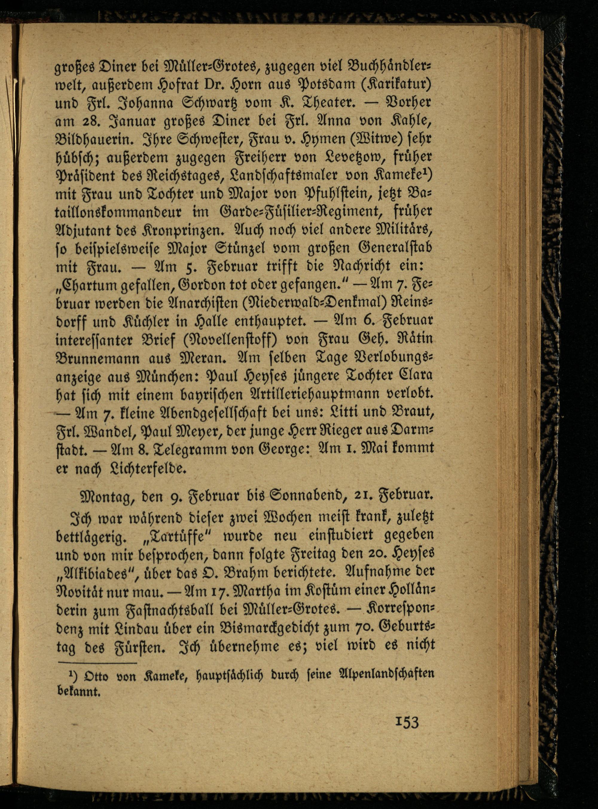 großes Diner bei Müller-Grotes, zugegen viel Buchhändlerwelt, außerdem Hofrat Dr. Horn aus Potsdam (Karikatur) und Frl. Johanna Schwartz vom K. Theater. — Vorher am 28. Januar großes Diner bei Frl. Anna von Kahle, Bildhauerin. Ihre Schwester, Frau v. Hymen (Witwe) sehr hübsch; außerdem zugegen Freiherr von Levetzow, früher Präsident des Reichstages, Landschaftsmaler von Kameke mit Frau und Tochter und Major von Pfuhlstein, jetzt Bataillonskommandeur im Garde-Füsilier-Regiment, früher Adjutant des Kronprinzen. Auch noch viel andere Militärs, so beispielsweise Major Stünzel vom großen Generalstab mit Frau. — Am 5. Februar trifft die Nachricht ein: „Chartum gefallen, Gordon tot oder gefangen." — Am 7. Februar werden die Anarchisten (Niederwald-Denkmal) Reinsdorff und Küchler in Halle enthauptet. — Am 6. Februar interessanter Brief (Novellenstoff) von Frau Geh. Rätin Brunnemann aus Meran. Am selben Tage Verlobungsanzeige aus München: Paul Heyses jüngere Tochter Clara hat sich mit einem bayrischen Artilleriehauptmann verlobt. — Am 7. kleine Abendgesellschaft bei uns: Litti und Braut, Frl. Wandel, Paul Meyer, der junge Herr Rieger aus Darmstadt. — Am 8. Telegramm von George: Am 1. Mai kommt er nach Lichterfelde.