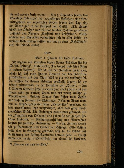 Ich begann mit Korrektur dreier kleiner Arbeiten für die „D.Jll. Zeitung": OnkelDodo, Im Coupe und Eine Frau in meinen Jahren *). Als ich mit der Korrektur fertig war, erfuhr ich, daß mein Freund Dominik von der Redaktion zurückgetreten und das Blatt selbst so gut wie verkracht sei. So müssen die kleinen Arbeiten vorläufig lagern; ich arbeitete mittlerweile an der Korrektur von „Stine". — Im K. Theater läpperte sichs so weiterhin; alles scheint aus den Fugen gehn zu wollen; Chaos und erst wenig Ansätze zu Neubildungen. Anfang Januar kam Ibsen nach Berlin und Anfang Februar die Meininger. Ibsen zu Ehren wurden im Residenz-Theater seine „Gespenster" gegeben, ein sehr interessantes, sehr meisterliches, aber doch ganz schiefgewickeltes Stück. Die Meininger debütierten glänzend mit der „Jungfrau von Orleans" und gaben sie den ganzen Februar hindurch. — Reichstagsauflösung und Neuwahlen sorgten für politische Aufregung. — Am 24. Januar waren wir zu Geburtstag und Soirée bei Lessings. Otto Lessing hatte eben in Erfahrung gebracht, daß ihn die Stadt mit Ausführung des Lessing-Denkmals betraut habe. — Sonst waren wir wenig in Gesellschaft, nur einmal bei Heydens,