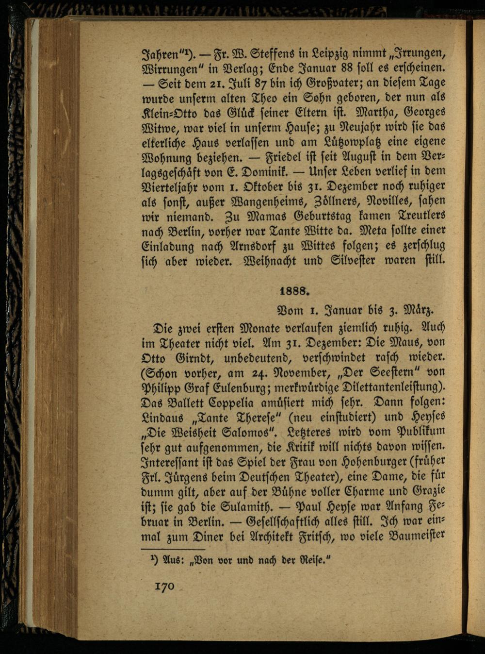 Jahren" *). — Fr. W. Steffens in Leipzig nimmt „Irrungen, Wirrungen" in Verlag; Ende Januar 88 soll es erscheinen. — Seit dem 21. Juli 87 bin ich Großvater; an diesem Tage wurde unserm alten Theo ein Sohn geboren, der nun als Klein-Otto das Glück seiner Eltern ist. Martha, Georges Witwe, war viel in unserm Hause; zu Neujahr wird sie das elterliche Haus verlassen und am Lützowplatz eine eigene Wohnung beziehen. — Friedel ist seit August in dem Verlagsgeschäft von E. Dominik. — Unser Leben verlief in dem Vierteljahr vom 1. Oktober bis 31. Dezember noch ruhiger als sonst, außer Wangenheims, Zöllners, Novilles, sahen wir niemand. Zu Mamas Geburtstag kamen Treutlers nach Berlin, vorher war Tante Witte da. Meta sollte einer Einladung nach Arnsdorf zu Wittes folgen; es zerschlug sich aber wieder. Weihnacht und Silvester waren still.