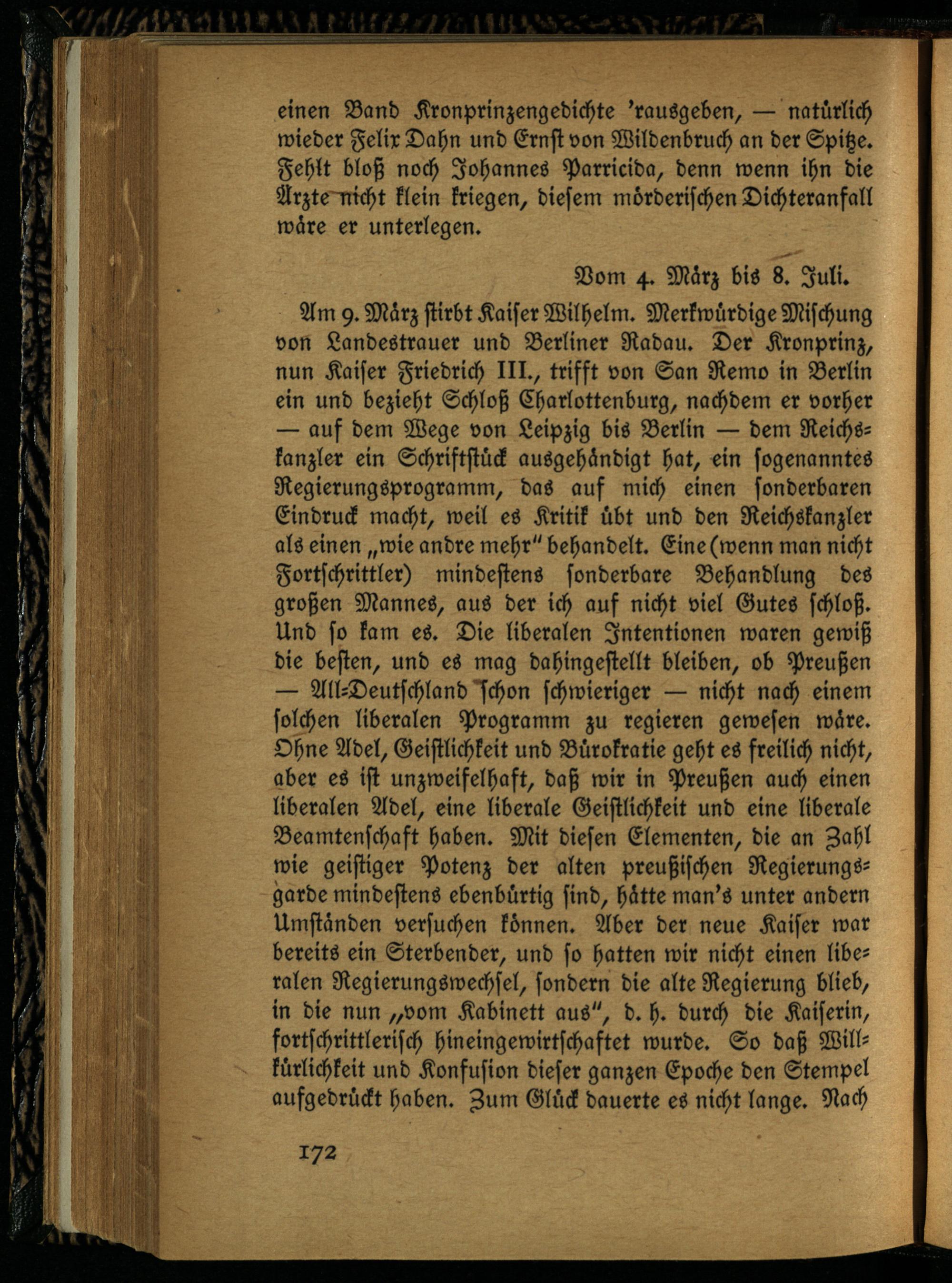 Am 9. März stirbt Kaiser Wilhelm. Merkwürdige Mischung von Landestrauer und Berliner Radau. Der Kronprinz, nun Kaiser Friedrich III., trifft von San Remo in Berlin ein und bezieht Schloß Charlottenburg, nachdem er vorher