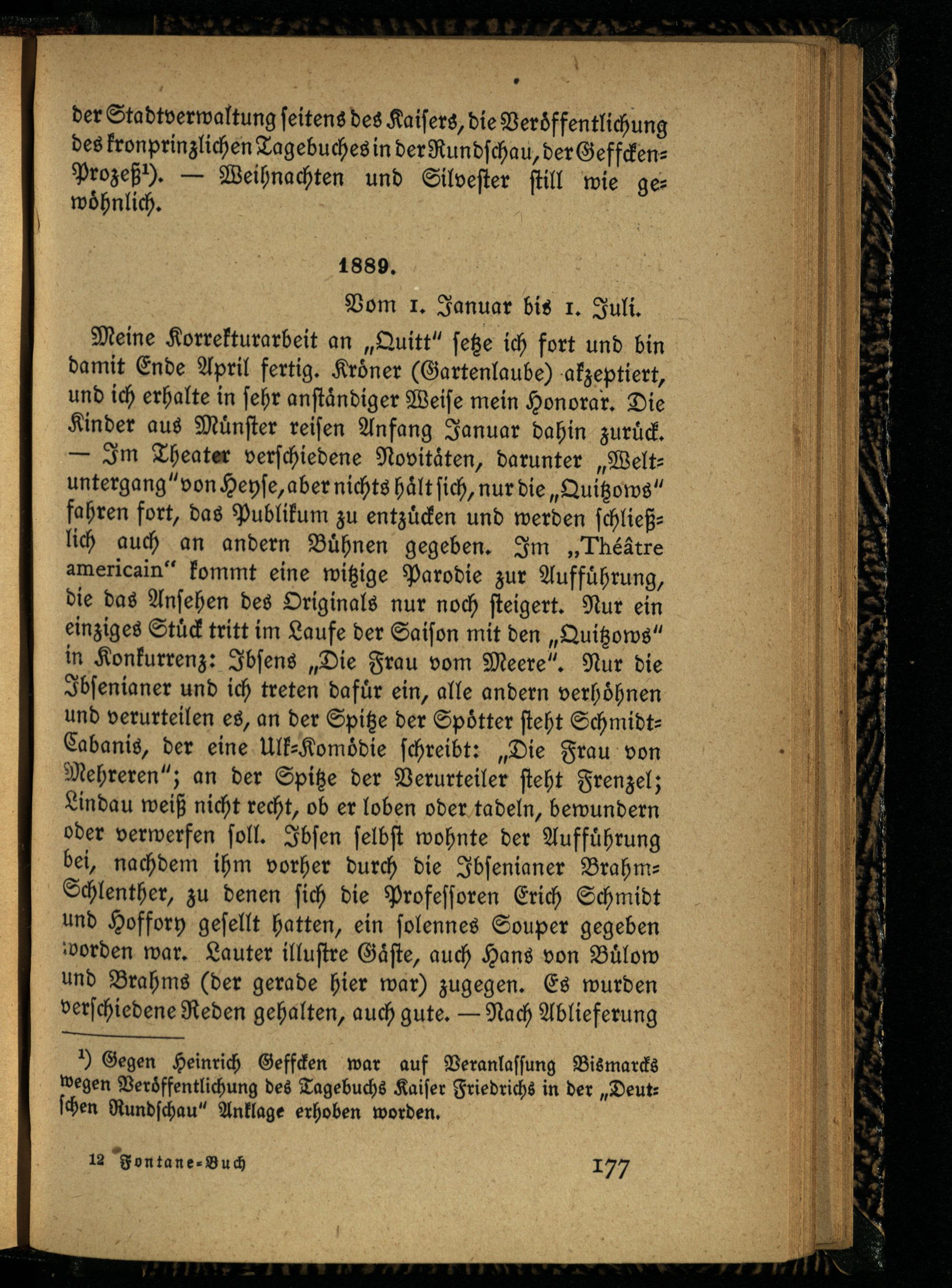 Meine Korrekturarbeit an „Quitt" setze ich fort und bin damit Ende April fertig. Kröner (Gartenlaube) akzeptiert, und ich erhalte in sehr anständiger Weise mein Honorar. Die Kinder aus Münster reisen Anfang Januar dahin zurück. — Im Theater verschiedene Novitäten, darunter „Weltuntergang" von Heyse, aber nichts hält sich, nur die „Quitzows" fahren fort, das Publikum zu entzücken und werden schließlich auch an andern Bühnen gegeben. Im „Dtieärre americain" kommt eine witzige Parodie zur Aufführung, die das Ansehen des Originals nur noch steigert. Nur ein einziges Stück tritt im Laufe der Saison mit den „Quitzows" in Konkurrenz: Ibsens „Die Frau vom Meere". Nur die Jbsenianer und ich treten dafür ein, alle andern verhöhnen und verurteilen es, an der Spitze der Spötter steht Schmidt- Cabanis, der eine Ulk-Komödie schreibt: „Die Frau von Mehreren"; an der Spitze der Verurteiler steht Frenzel; Lindau weiß nicht recht, ob er loben oder tadeln, bewundern oder verwerfen soll. Ibsen selbst wohnte der Aufführung bei, nachdem ihm vorher durch die Jbsenianer Brahm- Schlenther, zu denen sich die Professoren Erich Schmidt und Hoffory gesellt hatten, ein solennes Souper gegeben worden war. Lauter illustre Gäste, auch Hans von Bülow und Brahms (der gerade hier war) zugegen. Es wurden verschiedene Reden gehalten, auch gute. — Nach Ablieferung