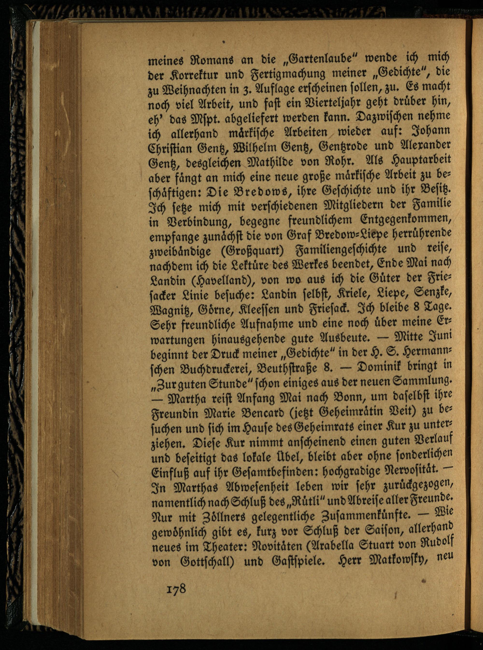 meines Romans an die „Gartenlaube" wende ich mich der Korrektur und Fertigmachung meiner „Gedichte", die zu Weihnachten in 3. Auflage erscheinen sollen, zu. Es macht noch viel Arbeit, und fast ein Vierteljahr geht drüber hin, eh' das Mspt. abgeliefert werden kann. Dazwischen nehme ich allerhand märkische Arbeiten wieder auf: Johann Christian Gentz, Wilhelm Gentz, Gentzrode und Alexander Gentz, desgleichen Mathilde von Rohr. Als Hauptarbeit aber fängt an mich eine neue große märkische Arbeit zu beschäftigen: Die Bredows, ihre Geschichte und ihr Besitz. Ich setze mich mit verschiedenen Mitgliedern der Familie in Verbindung, begegne freundlichem Entgegenkommen, empfange zunächst die von Graf Bredow-Liepe herrührende zweibändige (Großquart) Familiengeschichte und reise, nachdem ich die Lektüre des Werkes beendet, Ende Mai nach Landin (Havelland), von wo aus ich die Güter der Friesacker Linie besuche: Landin selbst, Krisle, Liepe, Senzke, Wagnitz, Görne, Kleessen und Friesack. Ich bleibe 8 Tage. Sehr freundliche Aufnahme und eine noch über meine Erwartungen hinausgehende gute Ausbeute. — Mitte Juni beginnt der Druck meiner „Gedichte" in der H. S. Hermann- schen Buchdruckerei, Beuthstraße 8. — Dominik bringt in „Zur guten Stunde" schon einiges aus der neuen Sammlung. — Martha reist Anfang Mai nach Bonn, um daselbst ihre Freundin Marie Bencard (jetzt Geheimrätin Veit) zu besuchen und sich im Hause des Geheimrats einer Kur zu unterziehen. Diese Kur nimmt anscheinend einen guten Verlauf und beseitigt das lokale Übel, bleibt aber ohne sonderlichen Einfluß auf ihr Gesamtbefinden: hochgradige Nervosität.