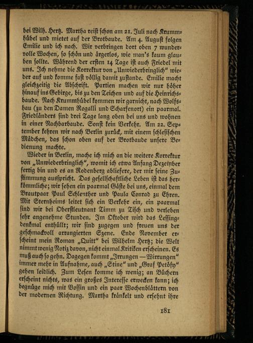 Wieder in Berlin, mache ich mich an die weitere Korrektur von „Unwiederbringlich", womit ich etwa Anfang Dezember fertig bin und es an Rodenberg abliefere, der mir seine Zustimmung ausspricht. Das gesellschaftliche Leben ist das herkömmliche; wir sehen ein paarmal Gäste bei uns, einmal dem Brautpaar Paul Schleicher und Paula Conrad zu Ehren. Mit Sternheims leitet sich ein Verkehr ein, ein paarmal sind wir bei Oberstleutnant Timm zu Tisch und verleben sehr angenehme Stunden. Im Oktober wird das Lessingdenkmal enthüllt; wir sind zugegen und freuen uns der geschmackvoll arrangierten Szene. Ende November erscheint mein Roman „Quitt" bei Wilhelm Hertz; die Welt nimmt wenig Notiz davon, nicht einmal Kritiken erscheinen. Es muß auch so gehn. Dagegen kommt „Irrungen—Wirrungen" immer mehr in Aufnahme, auch „Stine" und „Graf Petöfy" gehen leidlich. Zum Lesen komme ich wenig; an Büchern erscheint nichts, was ein großes Interesse erwecken kann; ich begnüge mich mit Vossin und ein paar Wochenblättern von der modernen Richtung. Martha kränkelt und ersehnt ihre
