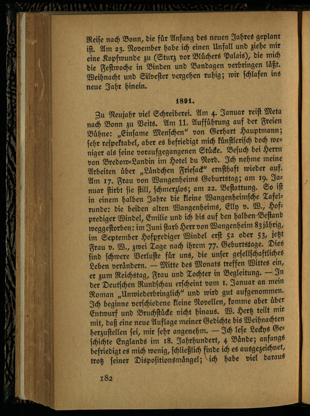 Iu Neujahr viel Schreiberei. Am 4. Januar reist Meta nach Bonn zu Veits. Am 11 . Aufführung auf der Freien Bühne: „Einsame Menschen" von Gerhart Hauptmann; sehr respektabel, aber es befriedigt mich künstlerisch doch weniger als seine vorausgegangenen Stücke. Besuch bei Herrn von Bredow-Landin im Hotel du Nord. Ich nehme meine Arbeiten über „Ländchen Friesack" ernsthaft wieder auf. Am 17. Frau von Wangenheims Geburtstag; am 19. Januar stirbt sie still, schmerzlos; am 22. Bestattung. So ist in einem halben Jahre die kleine Wangenheimsche Tafelrunde: die beiden alten Wangenheims, Elly v. W., Hofprediger Windel, Emilie und ich bis auf den halben Bestand weggestorben: im Juni starb Herr von Wangenheim 8z jährig, im September Hofprediger Windel erst 52 oder 53, jetzt Frau v. W., zwei Tage nach ihrem 77. Geburtstage. Dies sind schwere Verluste für uns, die unser gesellschaftliches Leben verändern. — Mitte des Monats treffen Wittes ein, er zum Reichstag, Frau und Tochter in Begleitung. — In der Deutschen Rundschau erscheint vom 1. Januar an mein Roman „Unwiederbringlich" und wird gut ausgenommen. Ich beginne verschiedene kleine Novellen, komme aber über Entwurf und Bruchstücke nicht hinaus. W. Hertz teilt mir mit, daß eine neue Auflage meiner Gedichte bis Weihnachten herzustellen sei, mir sehr angenehm. — Ich lese Leckys Geschichte Englands im 18. Jahrhundert, 4 Bände; anfangs befriedigt es mich wenig, schließlich finde ich es ausgezeichnet, trotz seiner Dispositionsmängel; ich habe viel daraus