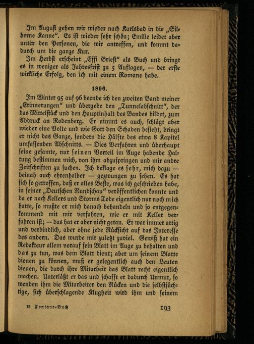 Im Winter 95 auf 96 beende ich den zweiten Band meiner „Erinnerungen" und übergebe den „Tunnelabschnitt", der das Mittelstück und den Hauptinhalt des Bandes bildet, zum Abdruck an Rodenberg. Er nimmt es auch, schlägt aber wieder eine Volte und wie Gott den Schaden besieht, bringt er nicht das Ganze, sondern die Hälfte des etwa 8 Kapitel umfassenden Abschnitts. — Dies Verfahren und überhaupt seine gesamte, nur seinen Vorteil im Auge habende Haltung bestimmen mich, von ihm abzuspringen und mir andre Zeitschriften zu suchen. Ich beklage es sehr, mich dazu — beinah auch ehrenhalber — gezwungen zu sehen. Es hat sich so getroffen, daß er alles Beste, was ich geschrieben habe, in seiner „Deutschen Rundschau" veröffentlichen konnte und da er nach Kellers und Storms Tode eigentlich nur noch mich hatte, so mußte er mich danach behandeln und so entgegenkommend mit mir verfahren, wie er mit Keller verfahren ist; — das hat er aber nicht getan. Er war immer artig und verbindlich, aber ohne jede Rücksicht auf das Interesse des andern. Das wurde mir zuletzt zuviel. Gewiß hat ein Redakteur allem vorauf sein Blatt im Auge zu behalten und das zu tun, was dem Blatt dient; aber um seinem Blatte dienen zu können, muß er gelegentlich auch den Leuten dienen, die durch ihre Mitarbeit das Blatt recht eigentlich machen. Unterläßt er das und schafft er dadurch Unmut, so wenden ihm die Mitarbeiter den Rücken und die selbstsüchtige, sich überschlagende Klugheit wird ihm und seinem