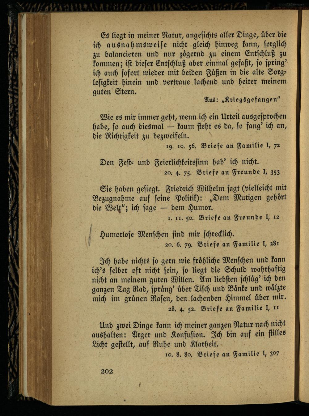 Es liegt in meiner Natur, angesichts aller Dinge, über die ich ausnahmsweise nicht gleich hinweg kann, sorglich zu balancieren und nur zögernd zu einem Entschluß zu kommen; ist dieser Entschluß aber einmal gefaßt, so spring' ich auch sofort wieder mit beiden Füßen in die alte Sorglosigkeit hinein und vertraue lachend und heiter meinem guten Stern.