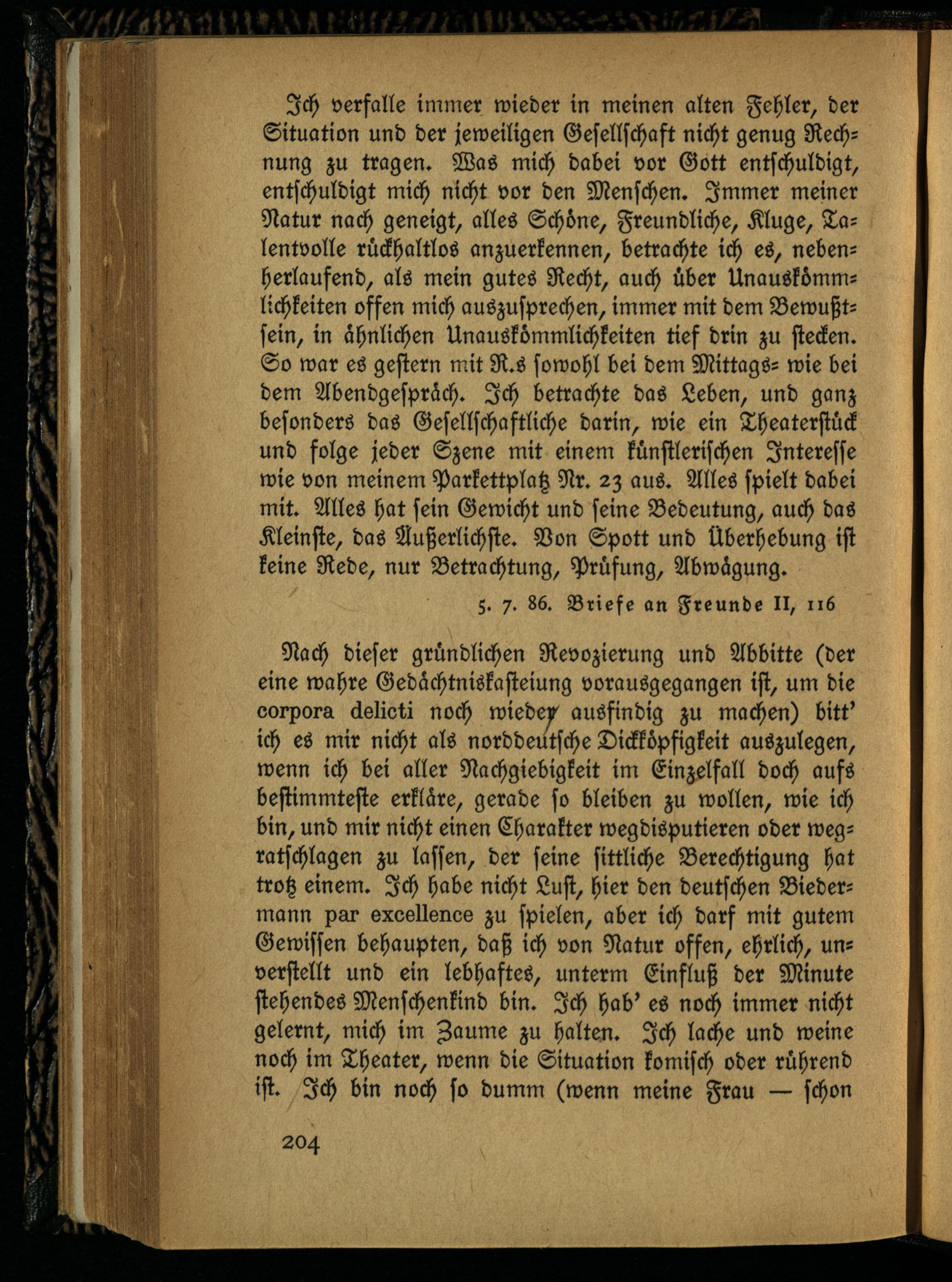 Nach dieser gründlichen Revozierung und Abbitte (der eine wahre Gedächtniskasteiung vorausgegangen ist, um die corpora clslioti noch wieder ausfindig zu machen) bitt' ich es mir nicht als norddeutsche Dickköpfigkeit auszulegen, wenn ich bei aller Nachgiebigkeit im Einzelfall doch aufs bestimmteste erkläre, gerade so bleiben zu wollen, wie ich bin, und mir nicht einen Charakter wegdisputieren oder wegratschlagen zu lassen, der seine sittliche Berechtigung hat trotz einem. Ich habe nicht Lust, hier den deutschen Biedermann par oxoolleuoo zu spielen, aber ich darf mit gutem Gewissen behaupten, daß ich von Natur offen, ehrlich, unverstellt und ein lebhaftes, unterm Einfluß der Minute stehendes Menschenkind bin. Ich Hab' es noch immer nicht gelernt, mich im Zaume zu halten. Ich lache und weine noch im Theater, wenn die Situation komisch oder rührend ist. Ich bin noch so dumm (wenn meine Frau — schon