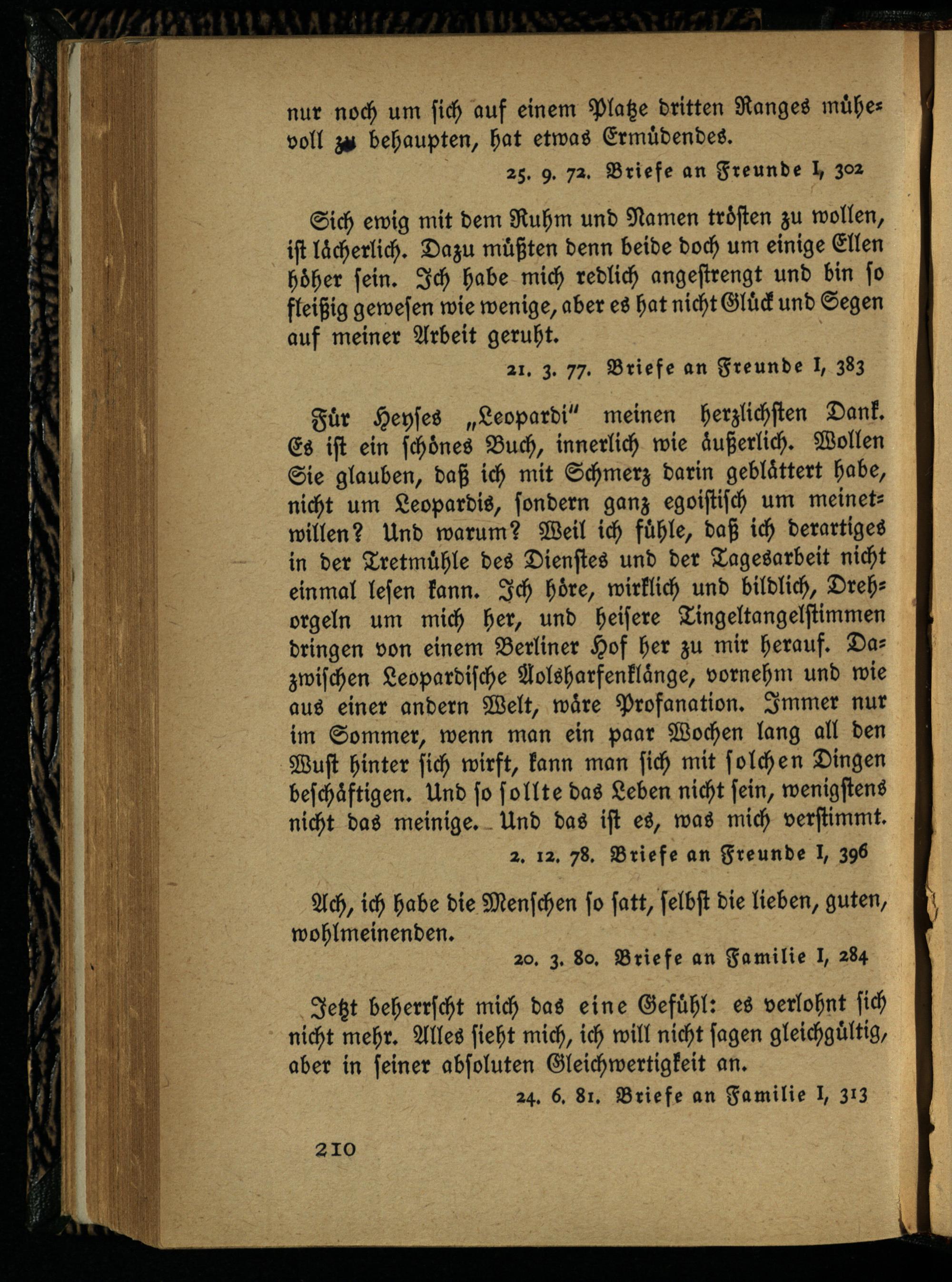 Für Heyses „Leopardi" meinen herzlichsten Dank. Es ist ein schönes Buch, innerlich wie äußerlich. Wollen Sie glauben, daß ich mit Schmerz darin geblättert habe, nicht um Leopardis, sondern ganz egoistisch um meinetwillen? Und warum? Weil ich fühle, daß ich derartiges in der Tretmühle des Dienstes und der Tagesarbeit nicht einmal lesen kann. Ich höre, wirklich und bildlich, Drehorgeln um mich her, und heisere Tingeltangelstimmen dringen von einem Berliner Hof her zu mir herauf. Dazwischen Leopardische Aolsharfenklänge, vornehm und wie aus einer andern Welt, wäre Prosanation. Immer nur im Sommer, wenn man ein paar Wochen lang all den Wust hinter sich wirft, kann man sich mit solchen Dingen beschäftigen. Und so sollte das Leben nicht sein, wenigstens nicht das meinige. Und das ist es, was mich verstimmt.
