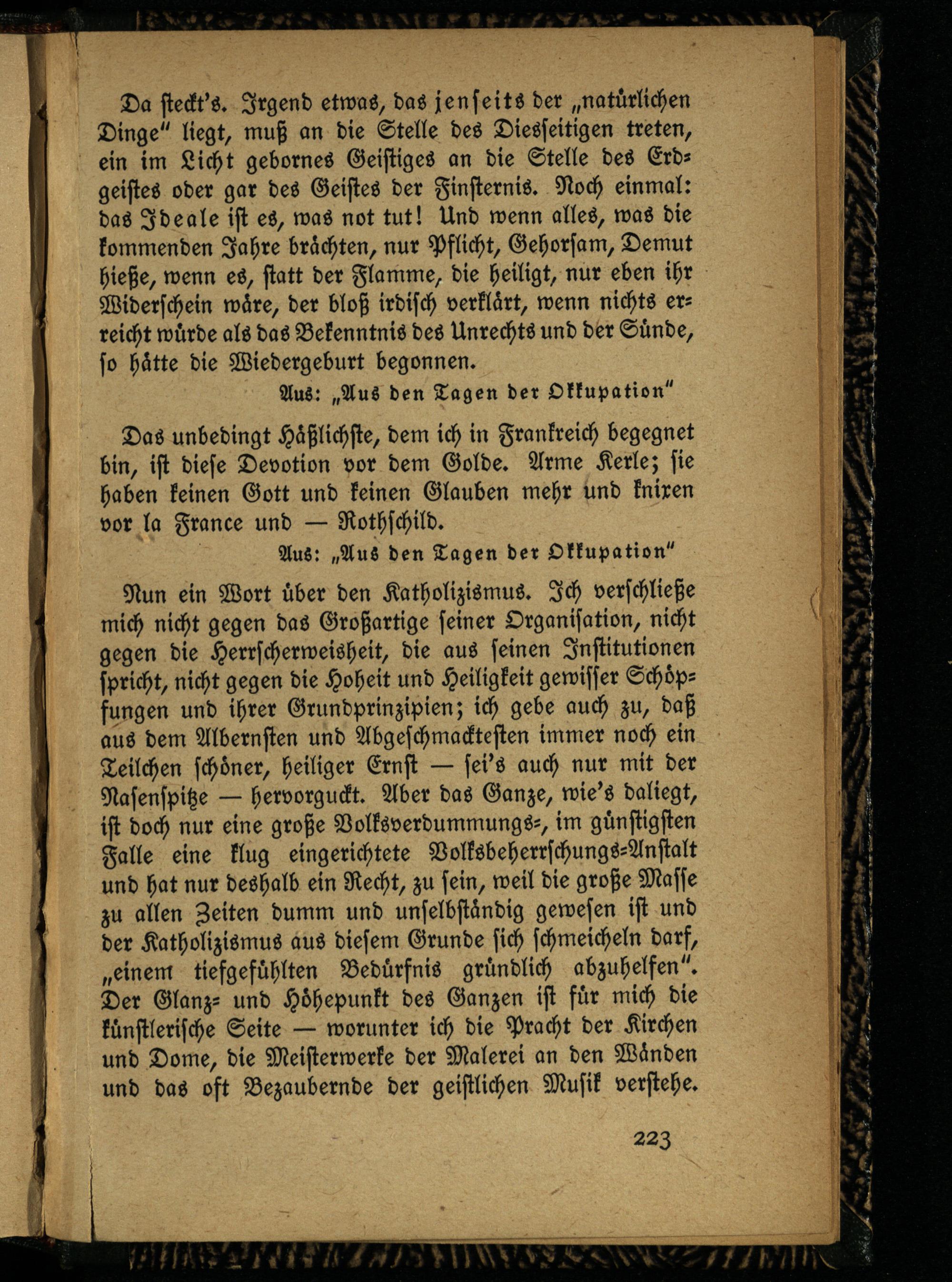 Nun ein Wort über den Katholizismus. Ich verschließe mich nicht gegen das Großartige seiner Organisation, nicht gegen die Herrscherweisheit, die aus seinen Institutionen spricht, nicht gegen die Hoheit und Heiligkeit gewisser Schöpfungen und ihrer Grundprinzipien; ich gebe auch zu, daß aus dem Albernsten und Abgeschmacktesten immer noch ein Teilchen schöner, heiliger Ernst — sei's auch nur mit der Nasenspitze — hervorguckt. Aber das Ganze, wie's daliegt, ist doch nur eine große Volksverdummungs-, im günstigsten Falle eine klug eingerichtete Volksbeherrschungs-Anstalt und hat nur deshalb ein Recht, zu sein, weil die große Masse zu allen Zeiten dumm und unselbständig gewesen ist und der Katholizismus aus diesem Grunde sich schmeicheln darf, „einem tiefgefühlten Bedürfnis gründlich abzuhelfen". Der Glanz- und Höhepunkt des Ganzen ist für mich die künstlerische Seite — worunter ich die Pracht der Kirchen und Dome, die Meisterwerke der Malerei an den Wänden und das oft Bezaubernde der geistlichen Musik verstehe.