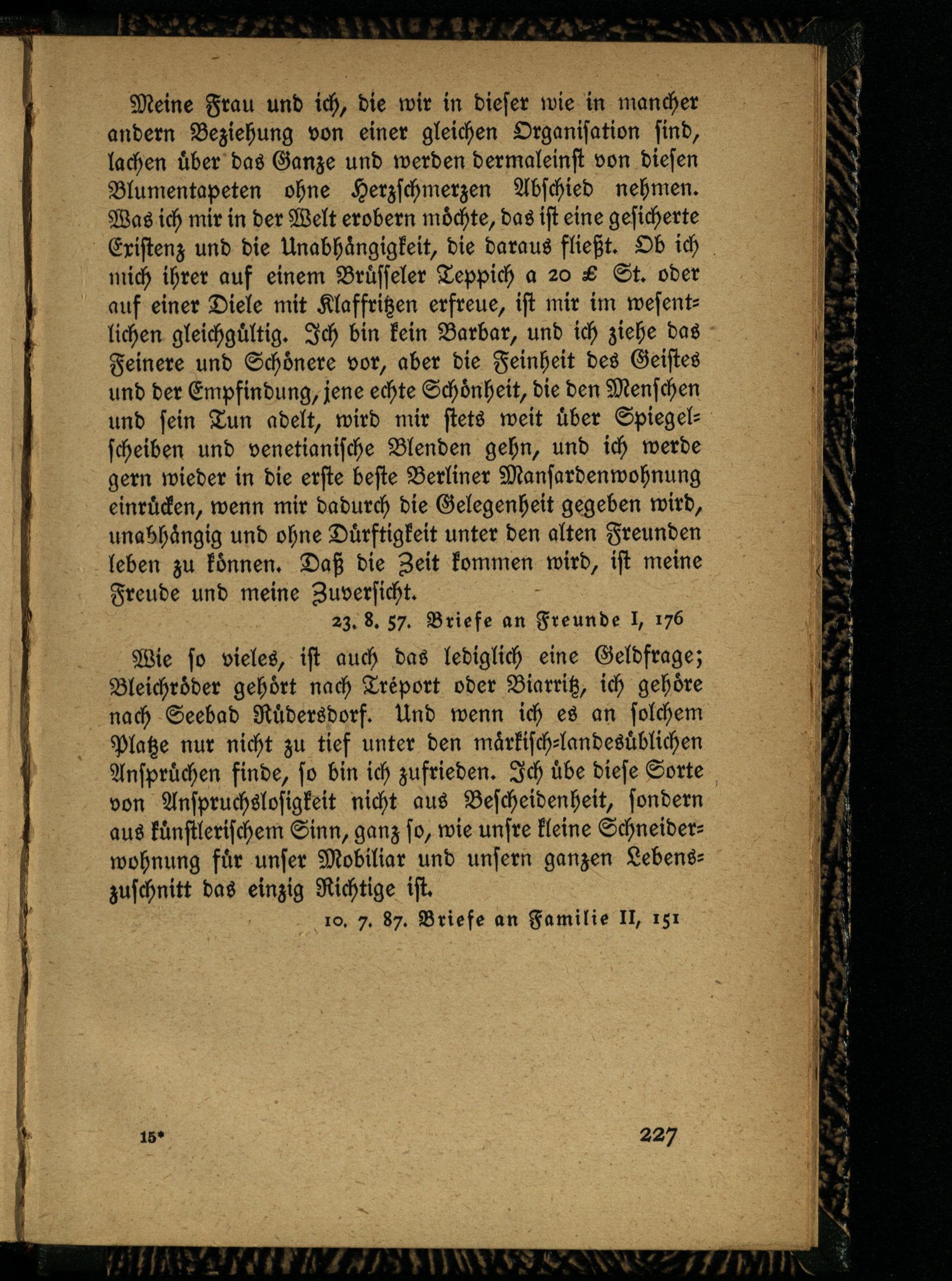 Wie so vieles, ist auch das lediglich eine Geldfrage; Bleichröder gehört nach Treport oder Biarritz, ich gehöre nach Seebad Rüdersdorf. Und wenn ich es an solchem Platze nur nicht zu tief unter den märkisch-landesüblichen Ansprüchen finde, so bin ich zufrieden. Ich übe diese Sorte von Anspruchslosigkeit nicht aus Bescheidenheit, sondern aus künstlerischem Sinn, ganz so, wie unsre kleine Schneiderwohnung für unser Mobiliar und unfern ganzen Lebenszuschnitt das einzig Richtige ist.