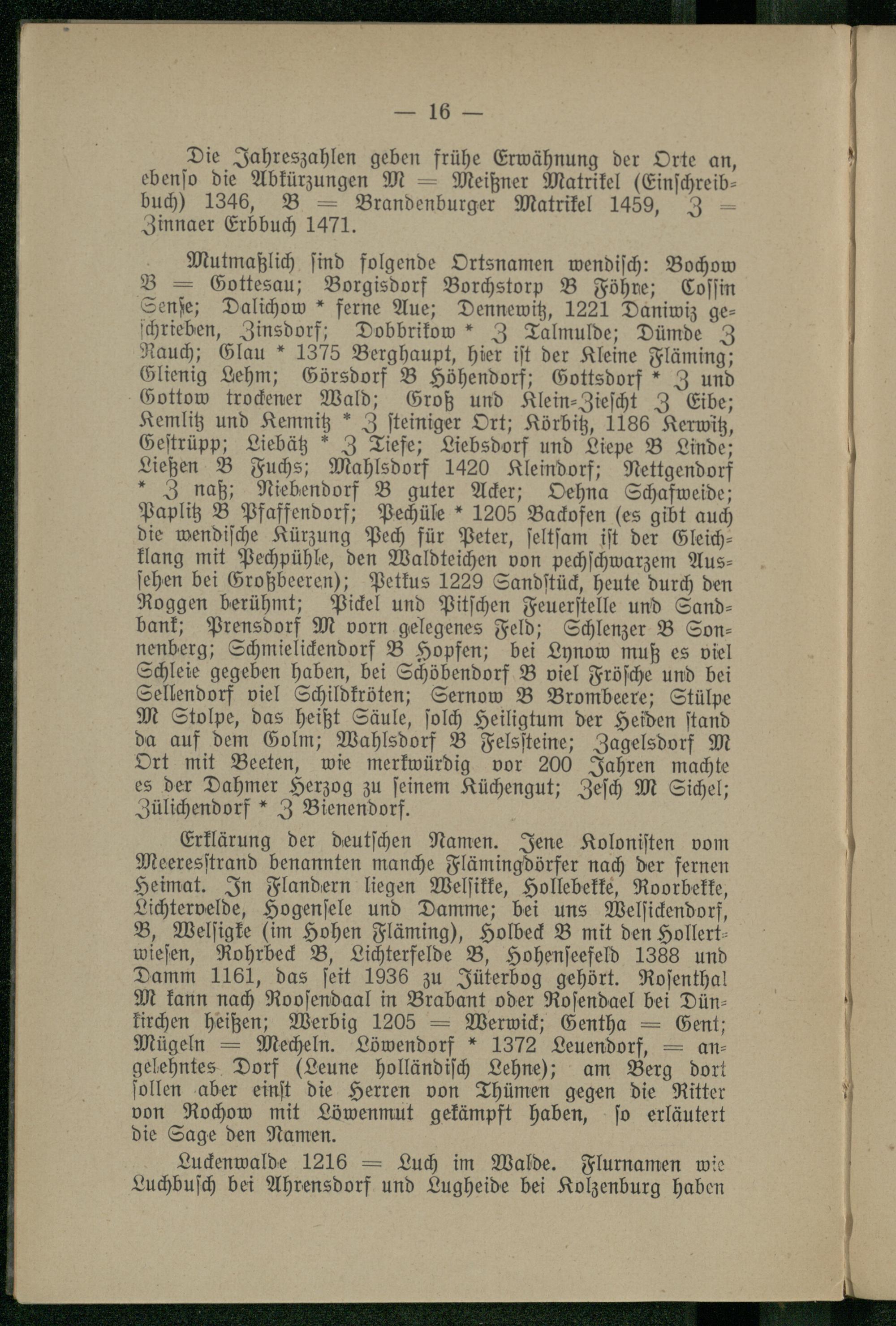 Luckenwalde 1216— Luch im Walde. Flurnamen wie Luchbuſch bei Ahrensdorf und Lugheide bei Kolzenburg haben