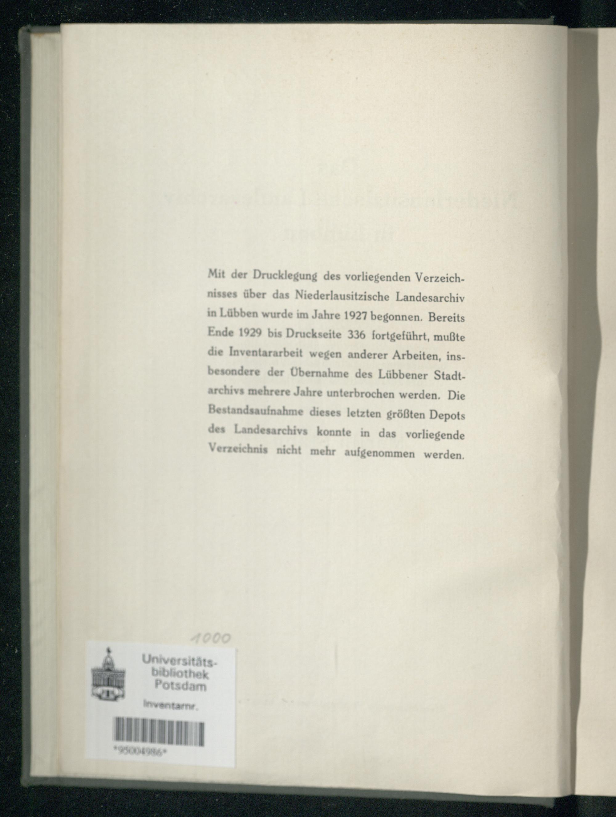 Mit der Drucklegung des vorliegenden Verzeichnisses über das Niederlausitzische Landesarchiv in Lübben wurde im Jahre 1927 begonnen. Bereits Ende 1929 bis Druckseite 336 fortgeführt, mußte die Inventararbeit wegen anderer Arbeiten, insbesondere der Übernahme des Lübbener Stadtarchivs mehrere Jahre unterbrochen werden. Die Bestandsaufnahme dieses letzten größten Depots des Landesarchivs konnte in das vorliegende Verzeichnis nicht mehr aufgenommen werden.