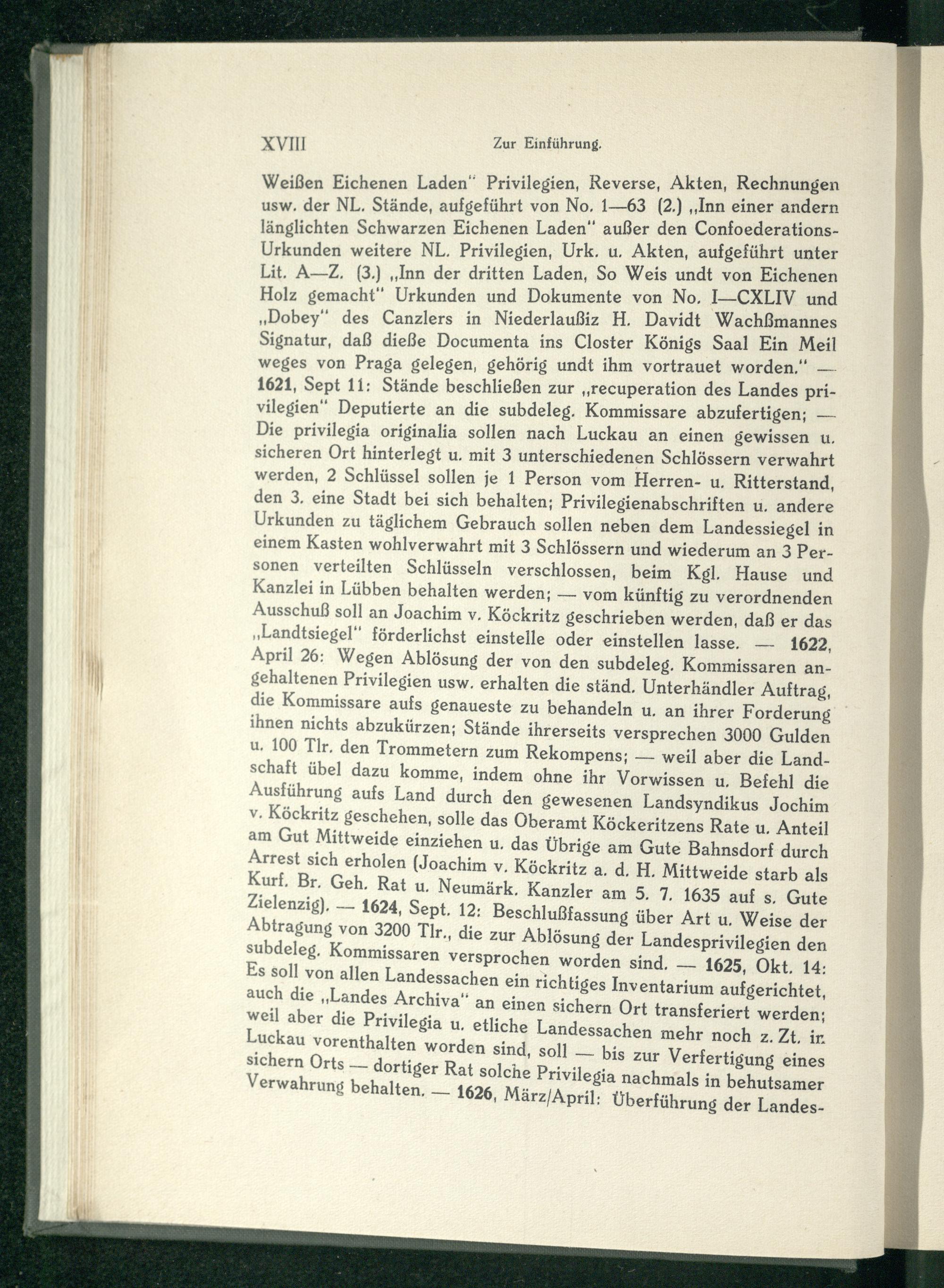 Weißen Eichenen Laden" Privilegien, Reverse, Akten, Rechnungen usw. der NL. Stände, aufgeführt von No. 1-63( 2.) ,, Inn einer andern länglichten Schwarzen Eichenen Laden" außer den ConfoederationsUrkunden weitere NL. Privilegien, Urk. u. Akten, aufgeführt unter Lit. A- Z.( 3.) ,, Inn der dritten Laden, So Weis undt von Eichenen Holz gemacht" Urkunden und Dokumente von No. I- CXLIV und ,, Dobey" des Canzlers in Niederlaußiz H. Davidt Wachẞmannes Signatur, daß dieße Documenta ins Closter Königs Saal Ein Meil weges von Praga gelegen, gehörig undt ihm vortrauet worden." 1621, Sept 11: Stände beschließen zur ,, recuperation des Landes privilegien" Deputierte an die subdeleg. Kommissare abzufertigen; Die privilegia originalia sollen nach Luckau an einen gewissen u. sicheren Ort hinterlegt u. mit 3 unterschiedenen Schlössern verwahrt werden, 2 Schlüssel sollen je 1 Person vom Herren- u. Ritterstand, den 3. eine Stadt bei sich behalten; Privilegienabschriften u. andere Urkunden zu täglichem Gebrauch sollen neben dem Landessiegel in einem Kasten wohlverwahrt mit 3 Schlössern und wiederum an 3 Personen verteilten Schlüsseln verschlossen, beim Kgl. Hause und Kanzlei in Lübben behalten werden; vom künftig zu verordnenden Ausschuß soll an Joachim v. Köckritz geschrieben werden, daß er das ,, Landtsiegel" förderlichst einstelle oder einstellen lasse. 1622, April 26: Wegen Ablösung der von den subdeleg. Kommissaren angehaltenen Privilegien usw. erhalten die ständ. Unterhändler Auftrag, die Kommissare aufs genaueste zu behandeln u. an ihrer Forderung ihnen nichts abzukürzen; Stände ihrerseits versprechen 3000 Gulden u. 100 Tlr. den Trommetern zum Rekompens; weil aber die Landschaft übel dazu komme, indem ohne ihr Vorwissen u. Befehl die Ausführung aufs Land durch den gewesenen Landsyndikus Jochim v. Köckritz geschehen, solle das Oberamt Köckeritzens Rate u. Anteil am Gut Mittweide einziehen u. das Übrige am Gute Bahnsdorf durch Arrest sich erholen( Joachim v. Köckritz a. d. H. Mittweide starb als Kurf. Br. Geh. Rat u. Neumärk. Kanzler am 5. 7. 1635 auf s. Gute Zielenzig). 1624, Sept. 12: Beschlußfassung über Art u. Weise der Abtragung von 3200 Tlr., die zur Ablösung der Landesprivilegien den subdeleg. Kommissaren versprochen worden sind. 1625, Okt. 14: Es soll von allen Landessachen ein richtiges Inventarium aufgerichtet, auch die ,, Landes Archiva" an einen sichern Ort transferiert werden; weil aber die Privilegia u. etliche Landessachen mehr noch z. Zt. ir. Luckau vorenthalten worden sind, soll bis zur Verfertigung eines sichern Orts dortiger Rat solche Privilegia nachmals in behutsamer Verwahrung behalten. 1626, März/ April: Überführung der Landes