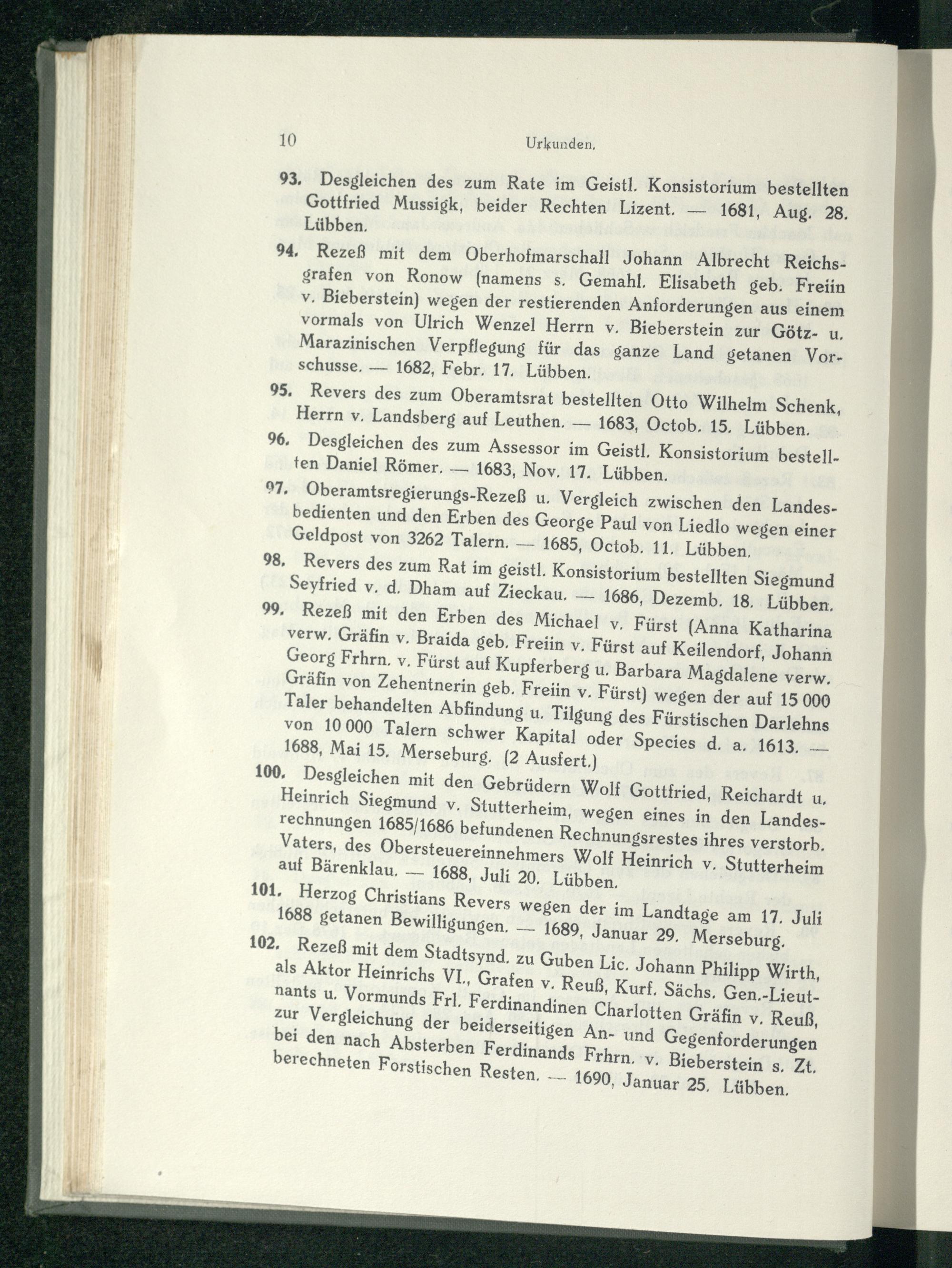 101. Herzog Christians Revers wegen der im Landtage am 17. Juli 1688 getanen Bewilligungen. 1689, Januar 29. Merseburg . 102. Rezeẞ mit dem Stadtsynd. zu Guben Lic. Johann Philipp Wirth, als Aktor Heinrichs VI., Grafen v. Reuß, Kurf. Sächs. Gen.- Lieutnants u. Vormunds Frl. Ferdinandinen Charlotten Gräfin v. Reuß, zur Vergleichung der beiderseitigen An- und Gegenforderungen bei den nach Absterben Ferdinands Frhrn. v. Bieberstein s. Zt. berechneten Forstischen Resten.- 1690, Januar 25. Lübben .