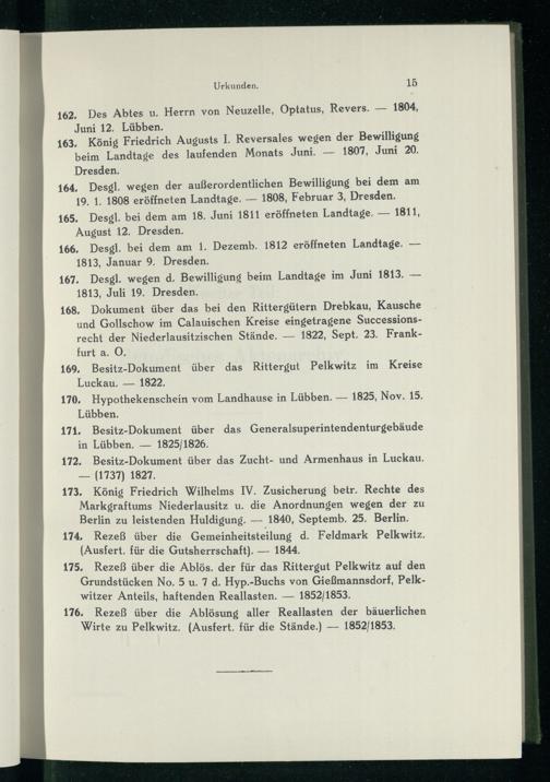 175, Rezeß über die Ablös, der für das Rittergut Pelkwitz auf den Grundstücken No. 5 u. 7 d. Hyp.-Buchs von Gießmannsdorf, Pelkwitzer Anteils, haftenden Reallasten. — 1852/1853.
