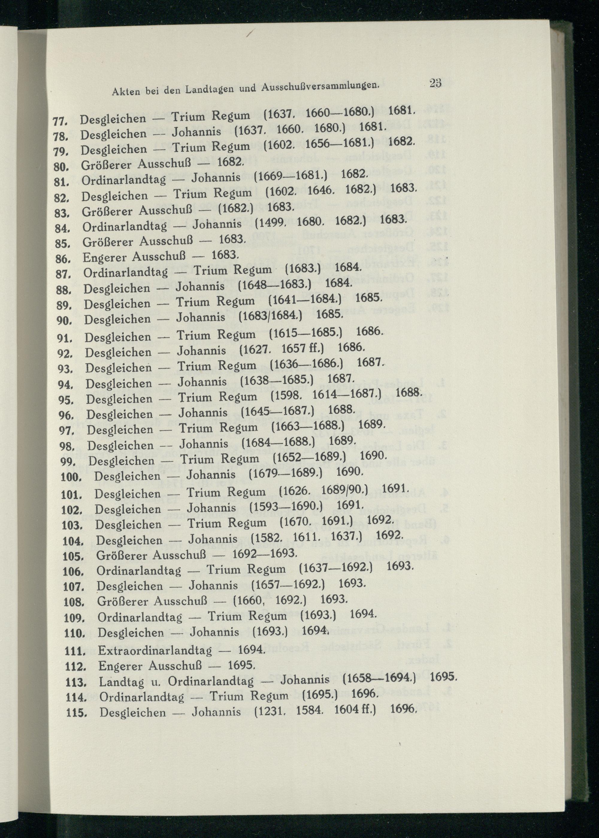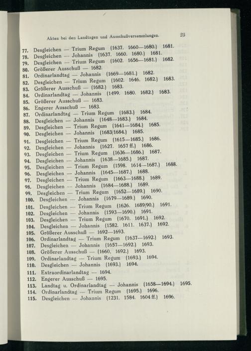 Ordinarlandtag— Trium Regum(1683.) 1684, Desgleichen— Johannis(1648—1683.) 1684. Desgleichen— Trium Regum(1641—1684,) 1685, Desgleichen— Johannis(1683/1684.) 1685, Desgleichen— Trium Regum(1615—1685,) 1686. Desgleichen— Johannis(1627. 1657 ff.) 1686, Desgleichen Trium Regum(1636—1686.) 1687. Desgleichen Johannis(1638—-1685,) 1687. Desgleichen Trium Regum(1598, 1614—1687.) Desgleichen Johannis(1645—1687,) 1688, Desgleichen Trium Regum(1663—1688,) 1689. Desgleichen— Johannis(1684—1688.) 1689. Desgleichen— Trium Regum(1652—1689,) 1690. Desgleichen— Johannis(1679-—1689.) 1690, Desgleichen— Trium Regum(1626. 1689/90.) 1691. Desgleichen— Johannis(1593—1690.) 1691. Desgleichen— Trium Regum(1670, 1691.) 1692. Desgleichen— Johannis(1582. 1611. 1637.) 1692. Größerer Ausschuß— 1692—1693,