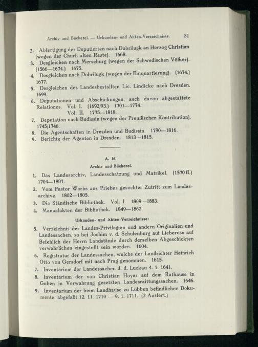 Urkunden- und Akten-Verzeichnisse: 5, Verzeichnis der Landes-Privilegien und andern Originalien und Landessachen, so bei Jochim v. d. Schulenburg auf Lieberose auf Befehlich der Herrn Landstände durch derselben Abgeschickten verwahrlichen eingestellt sein worden, 1604, 6. Registratur der Landessachen, welche der Landrichter Heinrich Otto von Gersdorf mit nach Prag genommen, 1615. 7, Inventarium der Landessachen d. d, Luckau 4, 1. 1641, 8. Inventarium der, von Christian Hoyer auf dem Rathause in Guben in Verwahrung gesetzten Landesraittungssachen, 1646, 9, Inventarium der beim Landhause zu Lübben befindlichen Dokumente, abgefaßt 12, 11. 1710— 9. 1. 1711,(2 Ausfert,)
