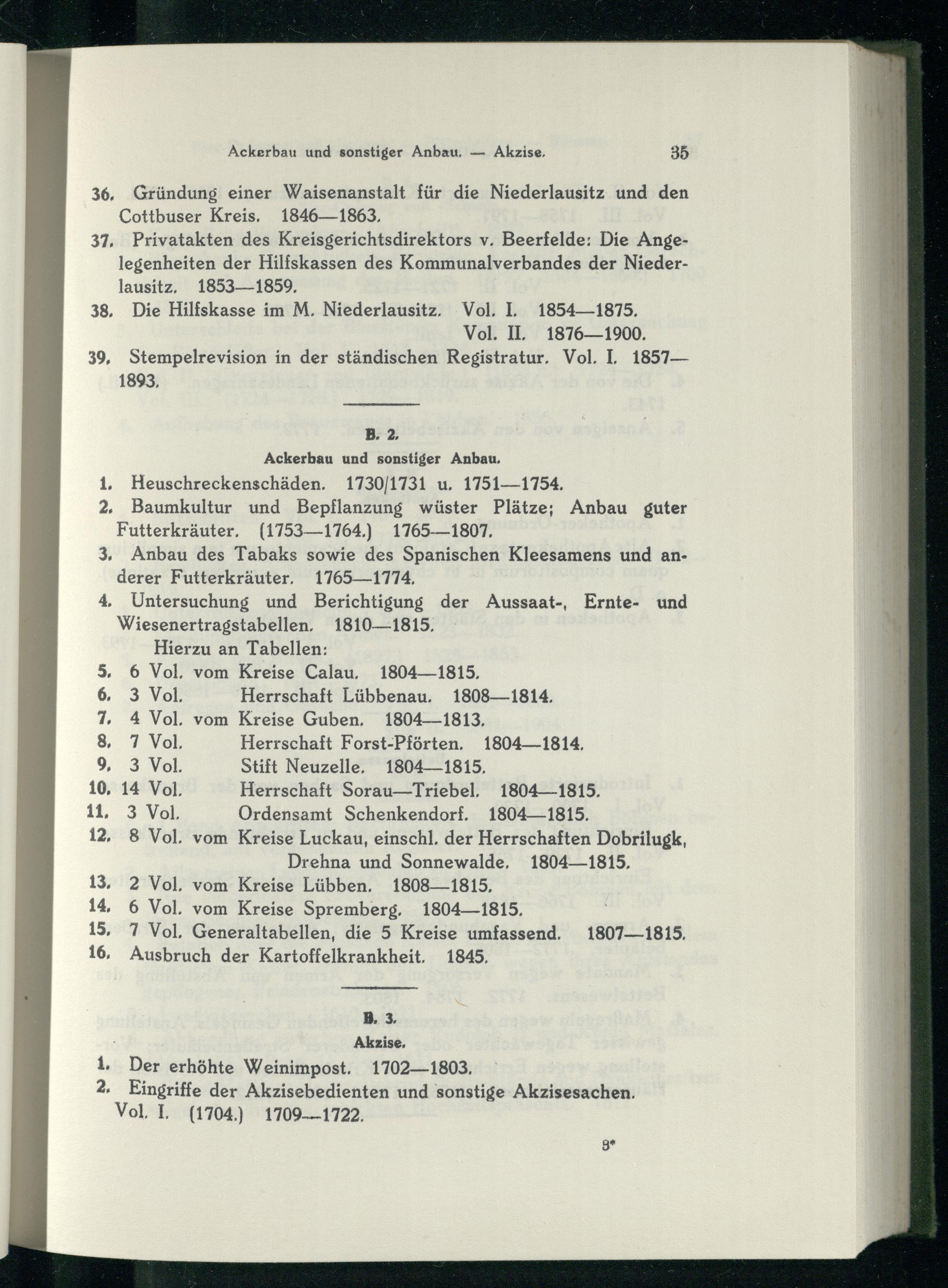 B. 2 Ackerbau und sonstiger Anbau, 1, Heuschreckenschäden. 1730/1731 u. 1751—1754. 2. Baumkultur und Bepflanzung wüster Plätze; Anbau guter Futterkräuter,(1753—1764.) 1765-—1807. 3, Anbau des Tabaks sowie des Spanischen Kleesamens und anderer Futterkräuter, 1765—1774, 4. Untersuchung und Berichtigung der Aussaat-, Ernte- und Wiesenertragstabellen, 1810—1815, Hierzu an Tabellen: 5, 6 Vol. vom Kreise Calau., 1804—1815, 6. 3 Vol. Herrschaft Lübbenau . 1808—1814. 7, 4 Vol. vom Kreise Guben . 1804—1813, 8, 7 Vol, Herrschaft Forst-Pförten. 1804—1814, 9, 3 Vol. Stift Neuzelle, 1804—1815, 10, 14 Vol. Herrschaft Sorau—Triebel, 1804—1815. 11, 3 Vol. Ordensamt Schenkendorf. 1804—1815. 12, 8 Vol. vom Kreise Luckau , einschl. der Herrschaften Dobrilugk , Drehna und Sonnewalde , 1804—1815, 13, 2 Vol, vom Kreise Lübben . 1808—1815, 14, 6 Vol. vom Kreise Spremberg , 1804—1815, 15, 7 Vol, Generaltabellen, die 5 Kreise umfassend. 1807—1815, 16, Ausbruch der Kartoffelkrankheit. 1845.