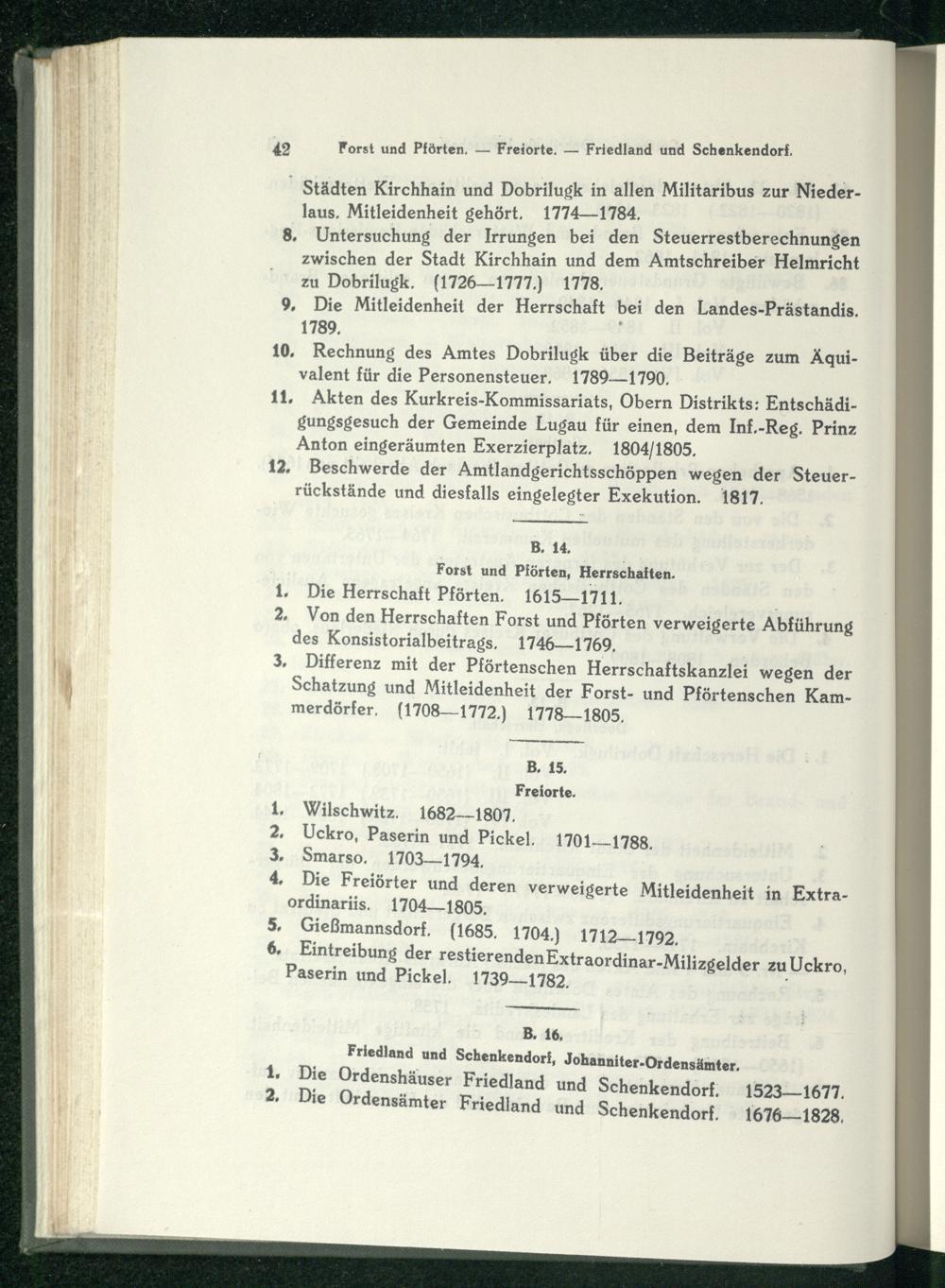 B. 15, Freiorte. Wilschwitz. 1682-1807. ‚ Uckro, Paserin und Pickel. 1701-—1788, 3, Smarso. 1703—1794, 4. Die Freiörter und deren verweigerte Mitleidenheit in Extraordinariis. 1704-—1805. 5, Gießmannsdorf,(1685, 1704.) 1712-1792,