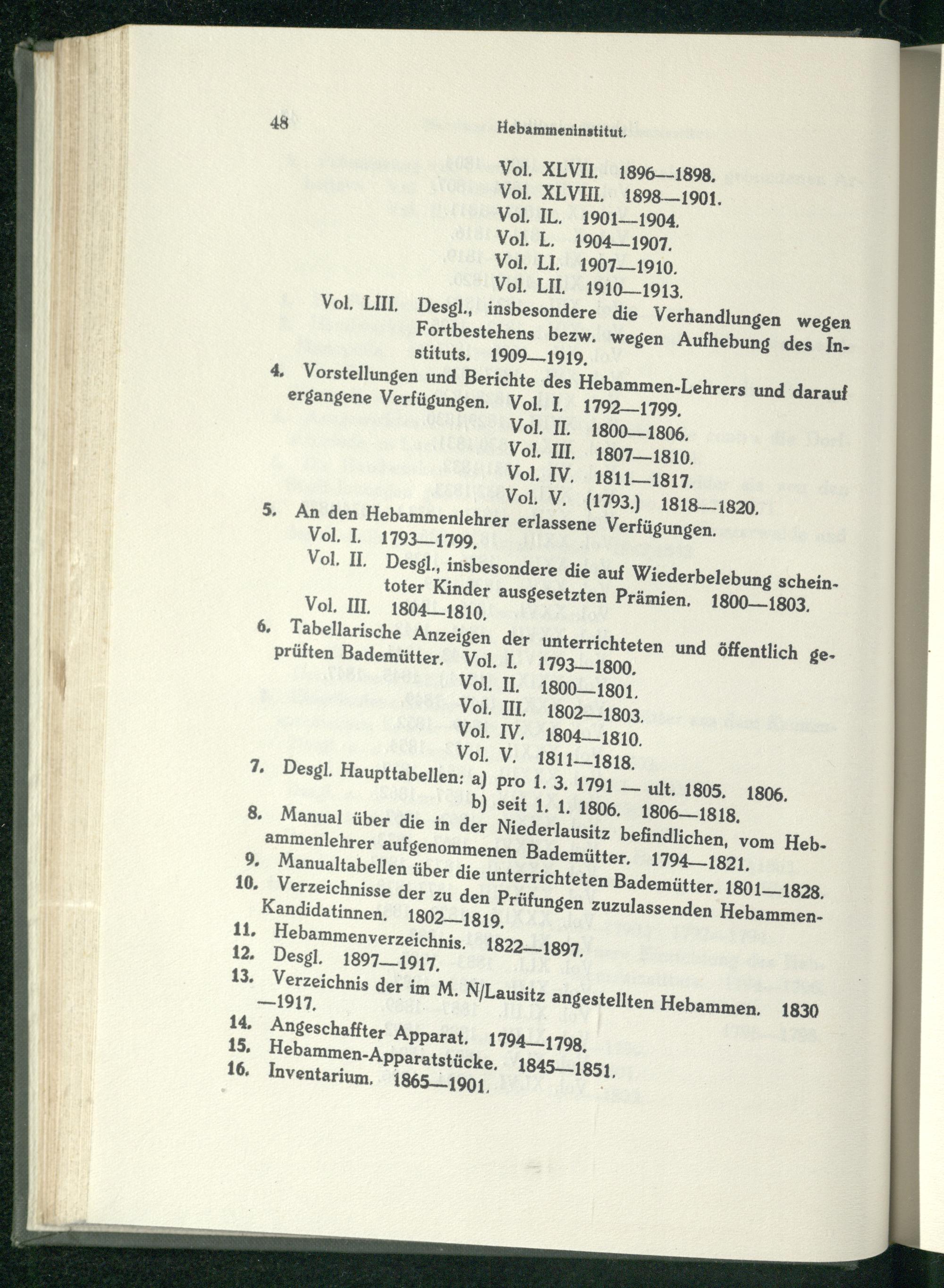Vol. XLVIL 1896——1898, Vol. XLVHL 1898-—1901. Vol. IL. 1901-—1904. Vol. L. 1904—1907. Vol. LI. 1907-—1910. Vol. LIL. 1910-1913, Vol, LIIL. Desgl., insbesondere die Verhandlungen wegen Fortbestehens bezw. wegen Aufhebung des Instituts, 1909—.1919, 4. Vorstellungen und Berichte des Hebammen-Lehrers und darauf ergangene Verfügungen. Vol. I. 1792—1799, Vol, IL 1800— 1806. Vol. II, 1807— 1810. Vol. IV, 1811—1817. (1793.) 1818-—— 1820.