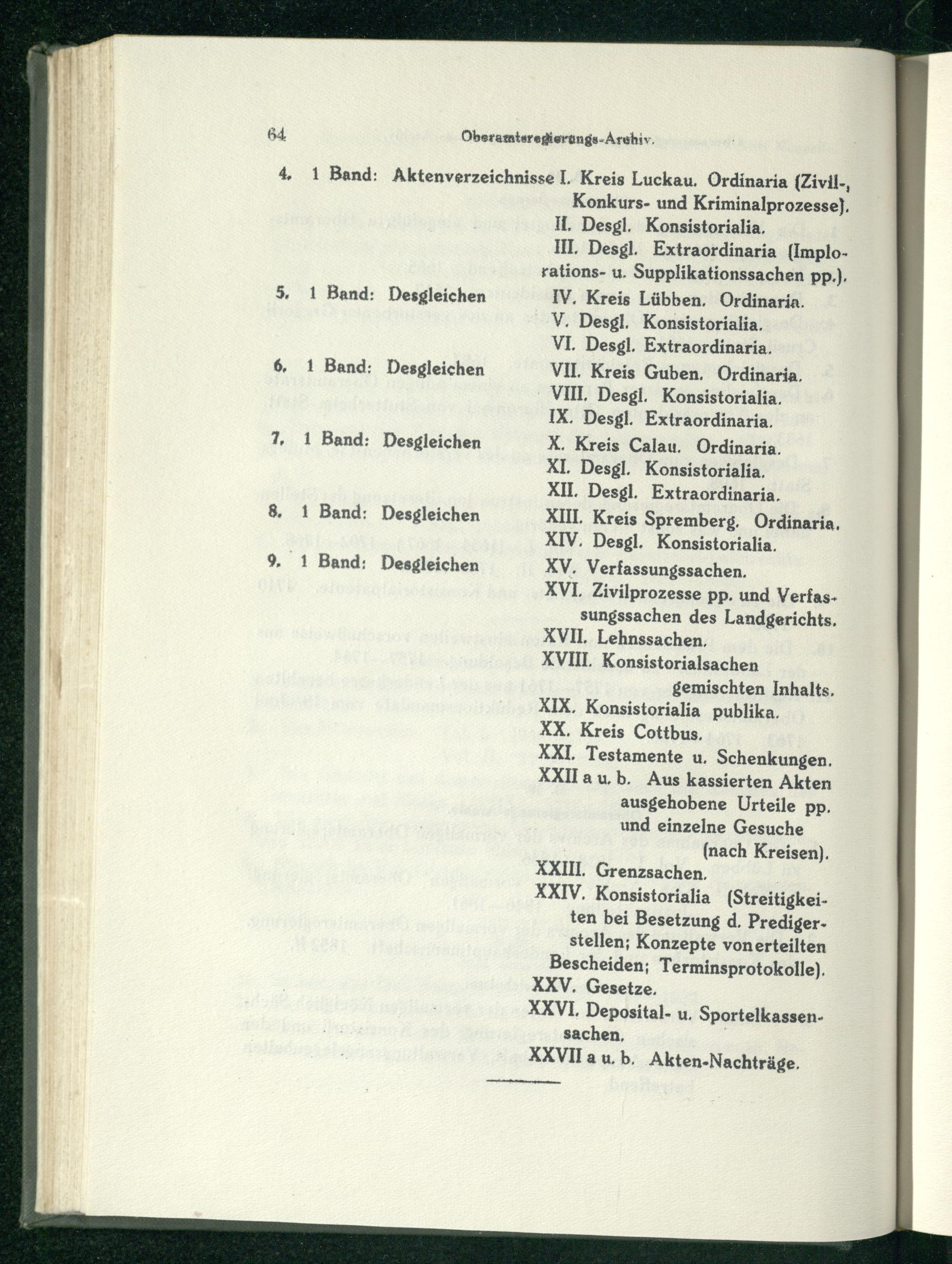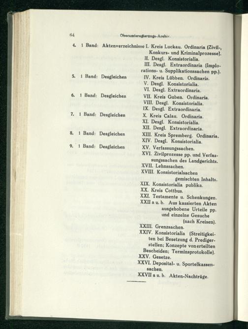 III. Desgl. Extraordinaria( Implorations- u. Supplikationssachen pp.). IV. Kreis Lübben. Ordinaria. V. Desgl. Konsistorialia. VI. Desgl. Extraordinaria. VII. Kreis Guben. Ordinaria. VIII. Desgl. Konsistorialia. IX. Desgl. Extraordinaria. X. Kreis Calau. Ordinaria. XI. Desgl. Konsistorialia. XII. Desgl. Extraordinaria. XIII. Kreis Spremberg. Ordinaria. XIV. Desgl. Konsistorialia. XV. Verfassungssachen.
