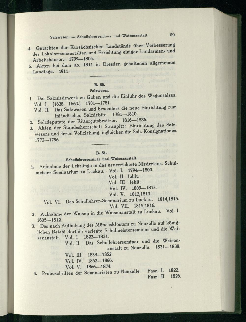 B. 50. Salzwesen, ji, Das Salzsiedewerk zu Guben und die Einfuhr des Wagensalzes. Vol. I.(1638. 1663.) 1701—1781, Vol. ILL. Das Salzwesen und besonders die neue Einrichtung zum inländischen Salzdebite. 1781—1810. 2, Salzdeputate der Rittergutsbesitzer. 1816—1836. 3, Akten der Standesherrschaft Straupitz: Einrichtung des Salzwesens und deren Vollziehung, ingleichen die Salz-Konsignationes. 1772-—1796.