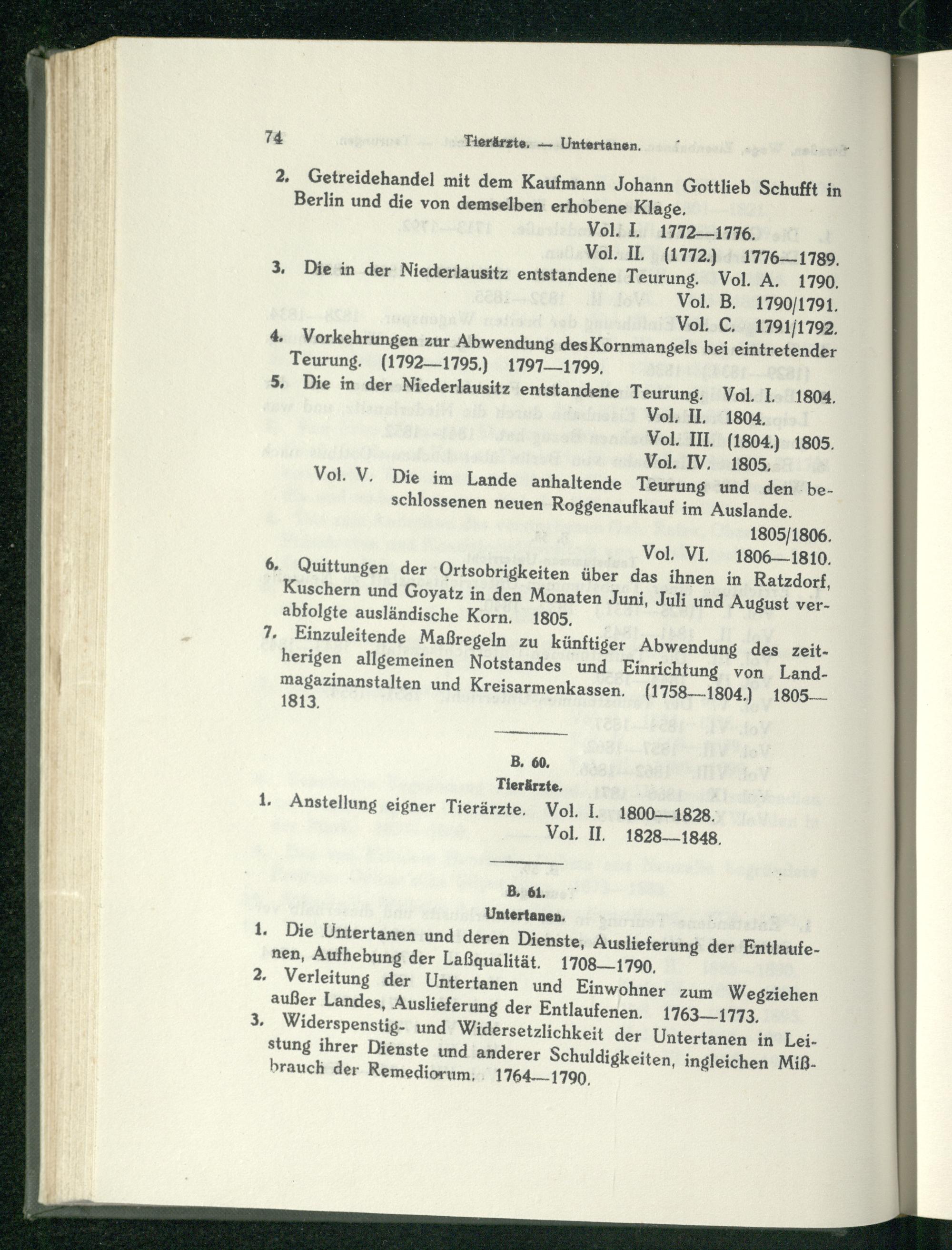 2, Getreidehandel mit dem Kaufmann Johann Gottlieb Schufft in Berlin und die von demselben erhobene Klage, Vol. I. 1772-—1776. Vol. IL(1772.) 1776—1789. 3, Die in der Niederlausitz entstandene Teurung. Vol. A. 1790. Vol. B, 1790/1791. Vol. C. 1791/1792, 4. Vorkehrungen zur Abwendung desKornmangels bei eintretender Teurung.(1792—1795.) 1797__1799. 5, Die in der Niederlausitz entstandene Teurung. Vol. 1. 1804. Vol; II. 1804. Vol. II.(1804.) 1805. Vol. IV, 1805, Vol. V. Die im Lande anhaltende Teurung und den beschlossenen neuen Roggenaufkauf im Auslande. 1805/1806, Vol. VI. 1806—1810. 6. Quittungen der Ortsobrigkeiten über das ihnen in Ratzdorf, Kuschern und Goyatz in den Monaten Juni, Juli und August verabfolgte ausländische Korn. 1805,