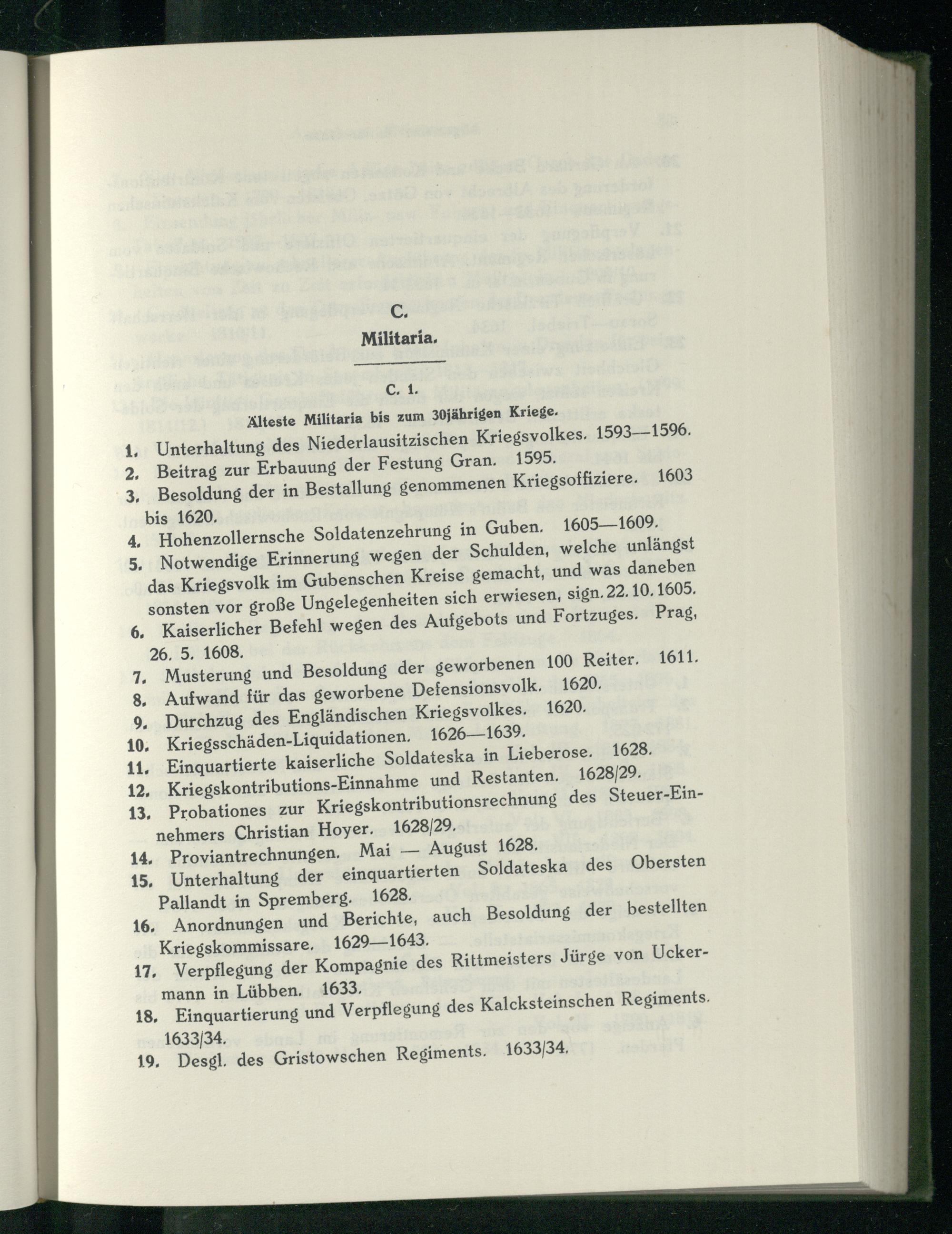 Musterung und Besoldung der geworbenen 100 Reiter, 1611. Aufwand für das geworbene Defensionsvolk, 1620, Durchzug des Engländischen Kriegsvolkes. 1620. Kriegsschäden-Liquidationen, 1626—1639. Einquartierte kaiserliche Soldateska in Lieberose . 1628, Kriegskontributions-Einnahme und Restanten, 1628/29. Probationes zur Kriegskontributionsrechnung des Steuer-Einnehmers Christian Hoyer, 1628/29, 14. Proviantrechnungen, Mai— August 1628, 15, Unterhaltung der einquartierten Soldateska des Obersten Pallandt in Spremberg . 1628, 16. Anordnungen und Berichte, auch Besoldung der bestellten Kriegskommissare, 1629—1643, 17, Verpflegung der Kompagnie des Rittmeisters Jürge von Uckermann in Lübben , 1633, 18, Einquartierung und Verpflegung des Kalcksteinschen Regiments, 1633/34. 19, Desgl. des Gristowschen Regiments. 1633/34,