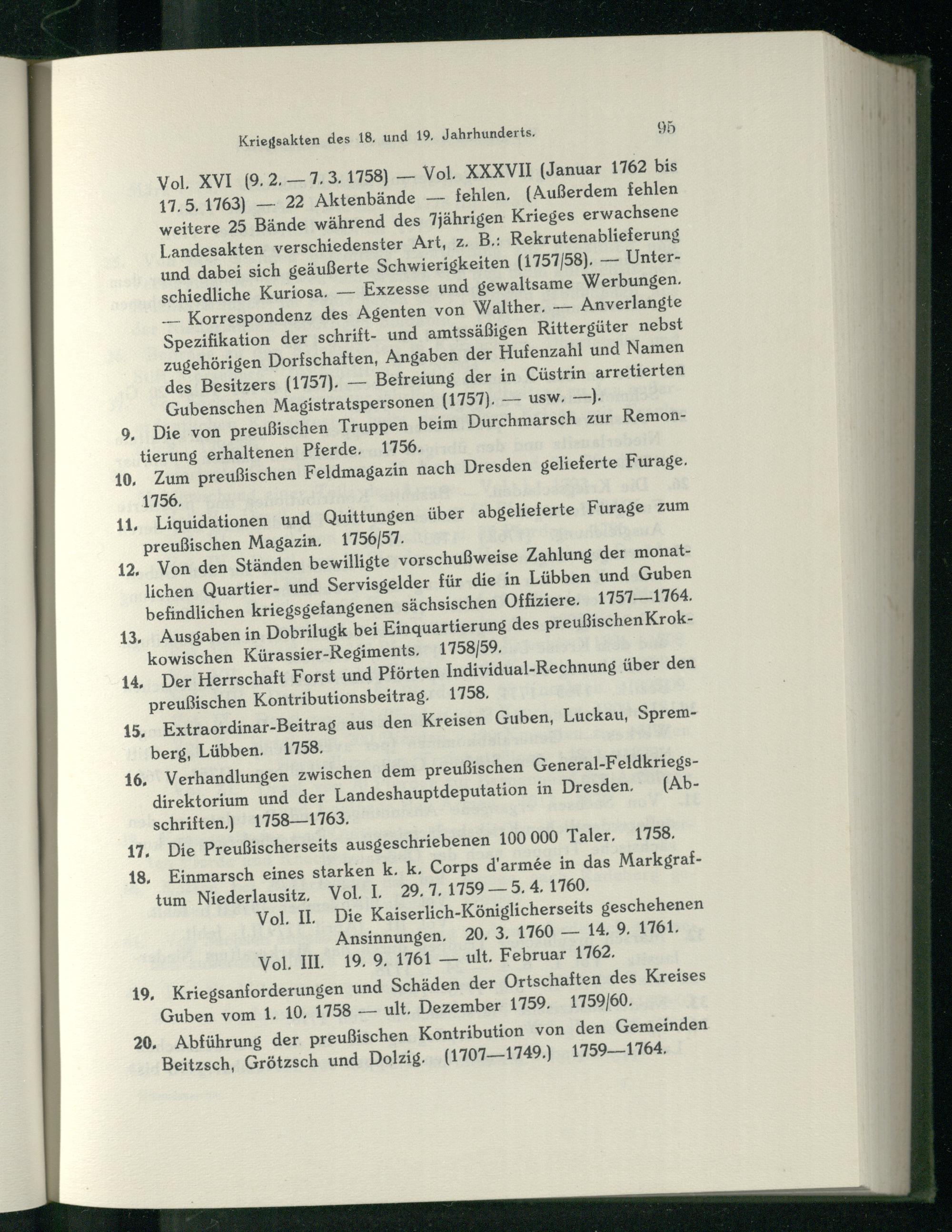 Kriegsakten des 18, und 19, Jahrhunderts, 95 Vol. XVI(9.2.— 7.3.1758)— Vol. XXXVII(Januar 1762 bis 17.5. 1763)— 22 Aktenbände— fehlen,(Außerdem fehlen weitere 25 Bände während des 7jährigen Krieges erwachsene Landesakten verschiedenster Art z.B Rekrutenablieferung und dabei sich geäußerte Schwierigkeiten(1757/58),— Unterschiedliche Kuriosa.— Exzesse und gewaltsame Werbungen. __. Korrespondenz des Agenten von Walther,— Anverlangte Spezifikation der schrift- und amtssäßigen Rittergüter nebst zugehörigen Dorfschaften, Angaben der Hufenzahl und Namen des Besitzers(1757).— Befreiung der in Cüstrin arretierten Gubenschen Magistratspersonen(1757),— usw.—)