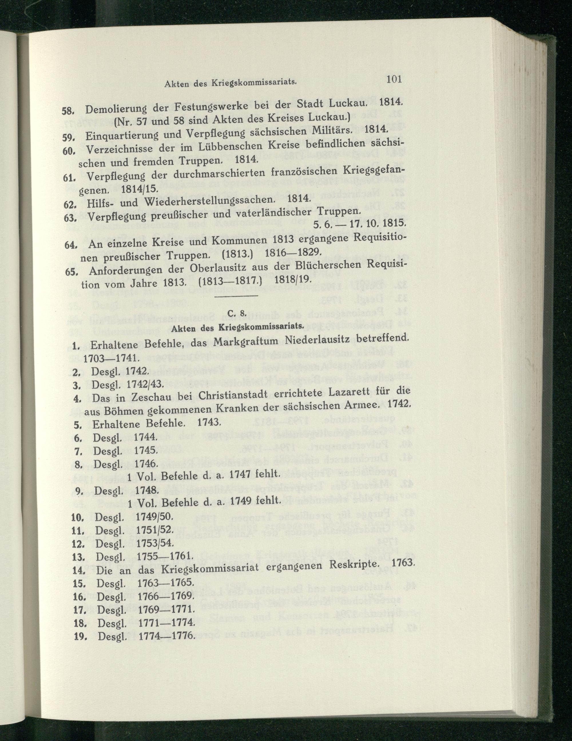 C. 8, Akten des Kriegskommissariats, 1, Erhaltene Befehle, das Markgraftum Niederlausitz betreffend. 1703—1741. 2. Desgl. 1742. 3, Desgl. 1742/43. 4, Das in Zeschau bei Christianstadt errichtete Lazarett für die aus Böhmen gekommenen Kranken der sächsischen Armee. 1742, 5, Erhaltene Befehle, 1743, 6. Desgl. 1744, 7. Desgl. 1745.