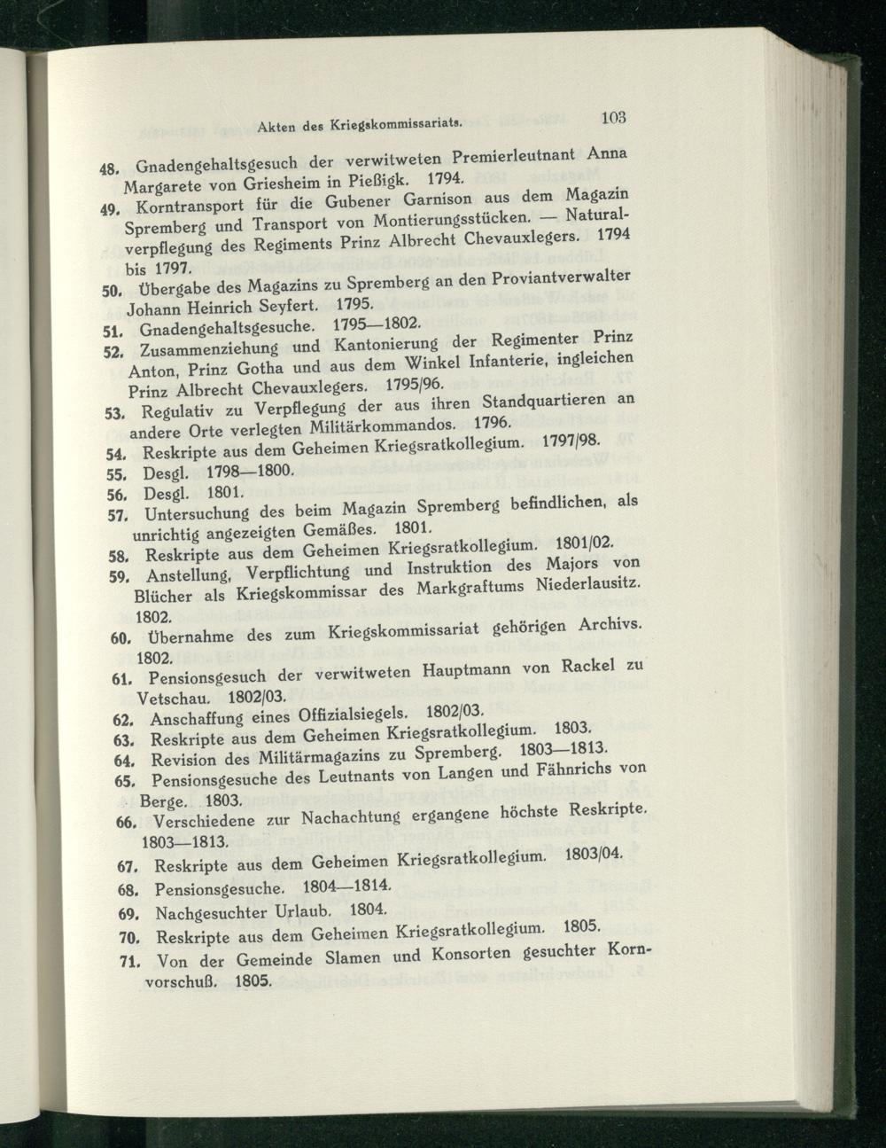 48, Gnadengehaltsgesuch der verwitweten Premierleutnant Anna Margarete von Griesheim in Pießigk. 1794. 49, Korntransport für die Gubener Garnison aus dem Magazin