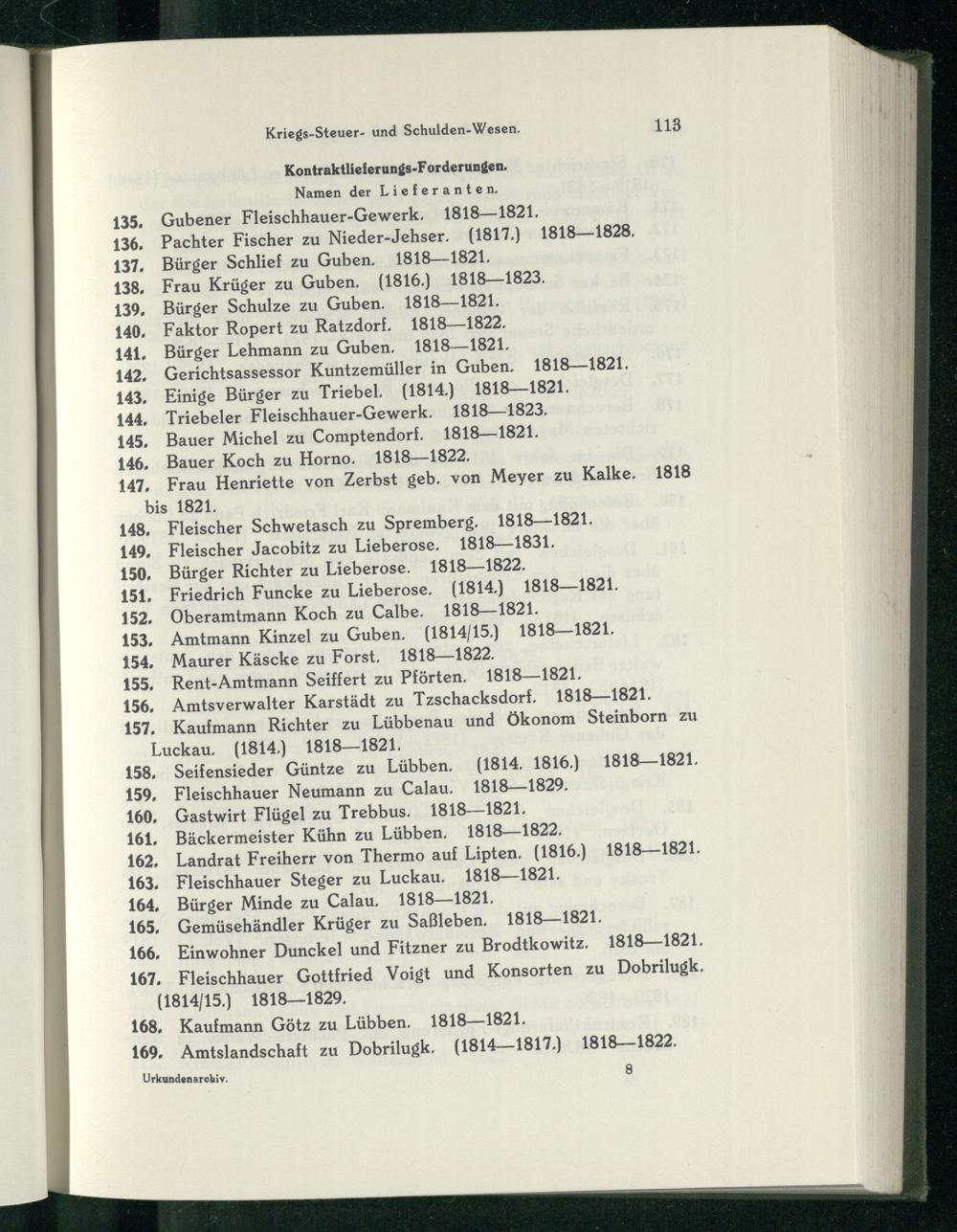 Kontraktlieferungs-Forderungen, Namen der Lieferanten, 135. Gubener Fleischhauer-Gewerk, 1818—1821, 136. Pachter Fischer zu Nieder-Jehser,(1817,) 1818—1828, 137. Bürger Schlief zu Guben , 1818— 1821, 138, Frau Krüger zu Guben ,(1816.) 1818—1823, 139, Bürger Schulze zu Guben , 1818—1821, 140. Faktor Ropert zu Ratzdorf, 1818—1822, 141, Bürger Lehmann zu Guben . 1818—1821. 142, Gerichtsassessor Kuntzemüller in Guben . 1818—1821. 143, Einige Bürger zu Triebel,(1814.) 1818—1821, 144, Triebeler Fleischhauer-Gewerk. 1818—1823. 145, Bauer Michel zu Comptendorf, 1818—1821. 146. Bauer Koch zu Horno. 1818—1822, 447. Frau Henriette von Zerbst geb. von Meyer zu Kalke, 1818 bis 1821, 148, Fleischer Schwetasch zu Spremberg , 1818—1821, 149, Fleischer Jacobitz zu Lieberose , 1818—1831, 150, Bürger Richter zu Lieberose . 1818—1822, 151, Friedrich Funcke zu Lieberose. (1814.) 1818—1821, 152, Oberamtmann Koch zu Calbe . 1818—1821., 153, Amtmann Kinzel zu Guben. (1814/15) 1818—1821, 454, Maurer Käscke zu Forst, 1818—1822, 155, Rent-Amtmann Seiffert zu Pförten, 1818—1821, 156, Amtsverwalter Karstädt zu Tzschacksdorf. 1818—1821, 157, Kaufmann Richter zu Lübbenau und Ökonom Steinborn zu Luckau ,(1814)- 1818—1821 158, Seifensieder Güntze zu Lübben. (1814. 1816.) 1818—1821. 159, Fleischhauer Neumann zu Calau , 1818—1829, 160. Gastwirt Flügel zu Trebbus. 1818—1821, 161, Bäckermeister Kühn zu Lübben , 1818—1822, 162. Landrat Freiherr von Thermo auf Lipten,(1816.) 1818—1821, 163. Fleischhauer Steger zu Luckau . 1818—1821. 164, Bürger Minde zu Calau , 1818—1821, 165, Gemüsehändler Krüger zu Saßleben, 1818—1821, 166. Einwohner Dunckel und Fitzner zu Brodtkowitz. 1818—1821. 167. Fleischhauer Gottfried Voigt und Konsorten zu Dobrilugk , (1814/15.) 1818—1829, 168, Kaufmann Götz zu Lübben , 1818—1821. 169, Amtslandschaft zu Dobrilugk ,(1814—1817.) 1818—1822,