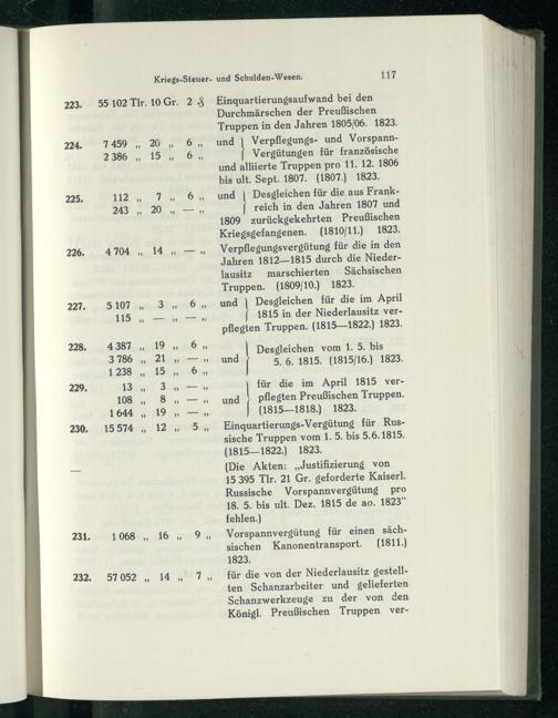 223. 55102 Tir. 10 Gr. 23 Einquartierungsaufwand bei den Durchmärschen der Preußischen Truppen in den Jahren 1805/06, 1823. 224. 1459©, 20„6, und\ Verpflegungs- und Vorspann2386„ 19’, 6| Vergütungen für französische und alliierte Truppen pro 11. 12. 1806 bis ult, Sept. 1807,(1807,) 1823. 225, 112.1 7.0. 6. und Desgleichen für die aus Frank243, 20 u— u{ reich in den Jahren 1807 und 1809 zurückgekehrten Preußischen Kriegsgefangenen,(1810/11.) 1823. 226. 4104„14 u— nm Verpflegungsvergütung für die in den Jahren 1812—1815 durch die Nieder lausitz marschierten Sächsischen Truppen.(1809/10.) 1823. 227. 5.107 4 3240006 an und| Desgleichen für die im April 145. ,, ent{1815 in der Niederlausitz verpflegten Truppen,(1815—1822.) 1823,